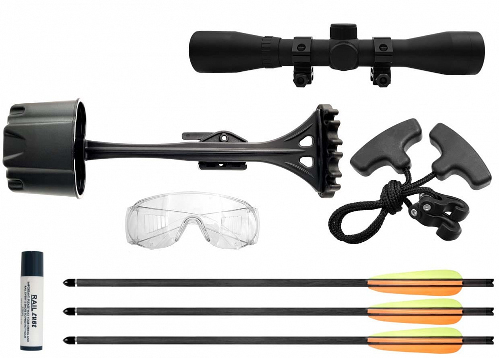 Комплектация : Полная: сборочный комплект, виброгасители для тетивы и плеч, прицел 4x32, натяжитель тетивы, воск, кивер, стрела арбалетная - 3 шт.