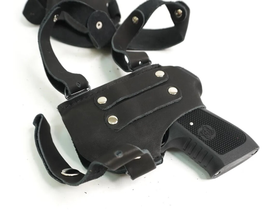 Крепление с одной стороны на резинке - это упрощает ежедневное использование кобуры. Возможно регулировать ремни и резинки по длине. Также, кобуру можно использовать как поясную, если отсоединить ремни. Крепится на ремень с помощью лямок.