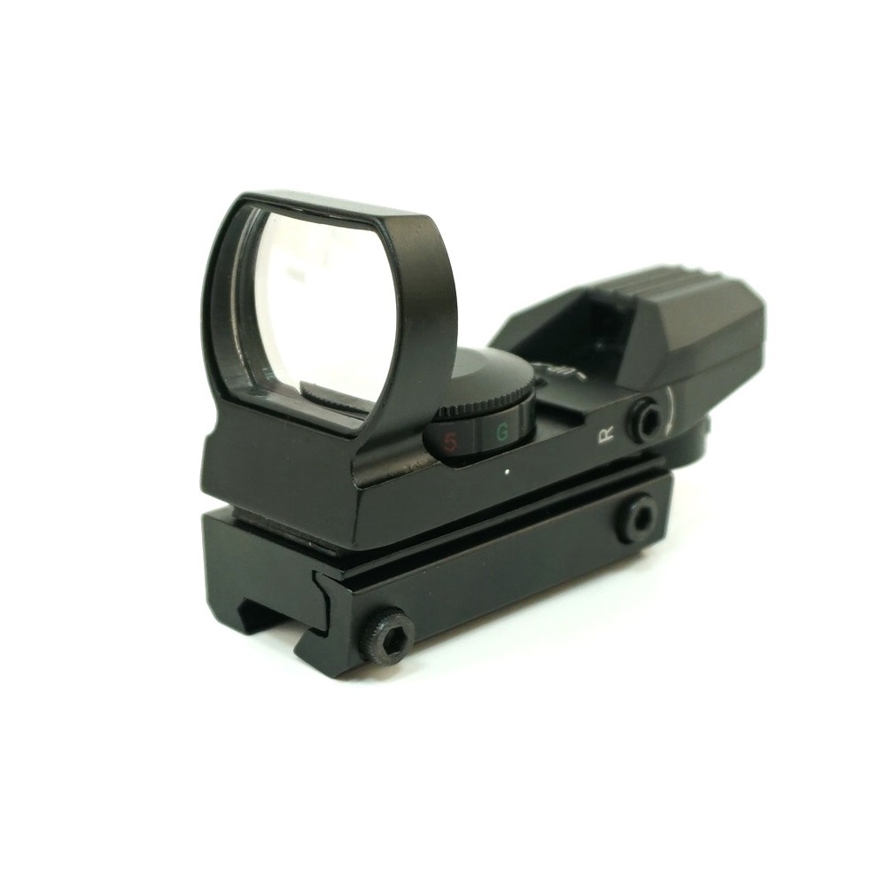 Прицел с широким углом обзора, идеально подходит для скорострельных типов оружия, для стрельбы по движущимся мишеням. Типы сетки (4 типа) — сменные. Подсветка зеленая/красная с регулировкой яркости. Регулировка по горизонтали осуществляется ключом-шестигранником, по вертикали — регулировочным винтом со стандартными делениями и фиксируется запирающим винтом.