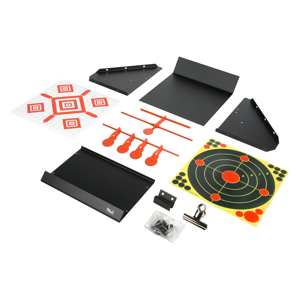 Миниатюрный тир оснащен ярко окрашенными металлическими мишенями на 5 целей, подвешенными на перекладине. При точном попадании мишени проворачиваются вокруг оси, создавая хорошо слышимый металлический щелчок. Такая реакция цели позволяет вести скоростную стрельбу без необходимости ручного возврата мишеней в исходное положение.