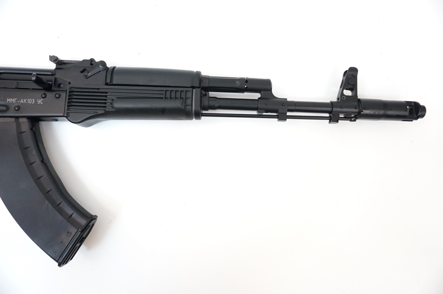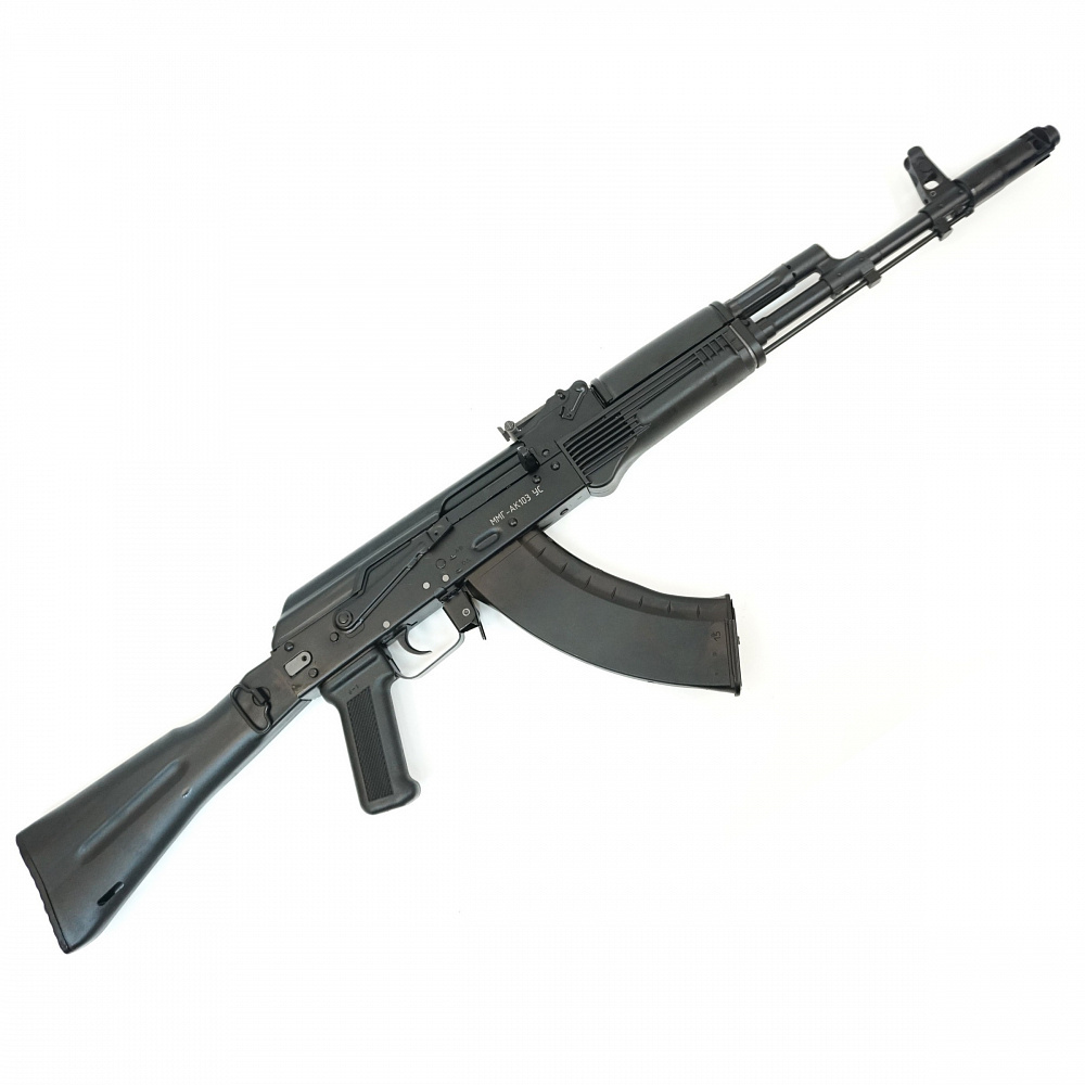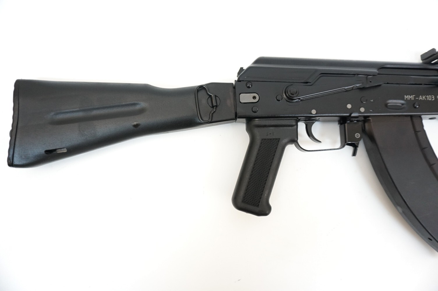 Макет автомата АК-103, складной приклад характеризуется полным сходством с боевым образцом. Данная модель произведена в заводских условиях, на оборудовании, выпускающем боевые аналоги. Переделка данной модификации в боевую невозможна из-за внесения в его конструкцию доработок, исключающих его боевую работоспособность. Процесс сборки и разборки макета полностью идентичен боевому образцу.