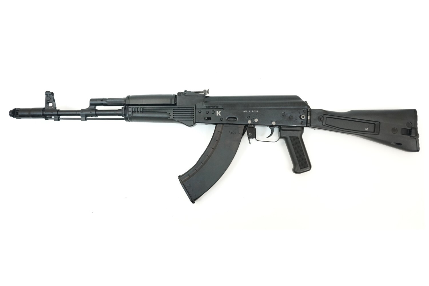 ММГ автомат АК-103, складной приклад – это точная копия прославленного боевого оружия «сотой серии». АК-103 – разработка Ижевского машиностроительного завода середины 90-х годов прошлого столетия, предназначенная на экспорт, под патрон 7,62x39 мм. За основу новой модификации взяли АК-74М. АК-103 считается наиболее известным и востребованным российским автоматом, поставляемым на экспорт. Модель отличалась высокой кучностью стрельбы очередями за счет использования в конструкции дульного тормоза-компенсатора.