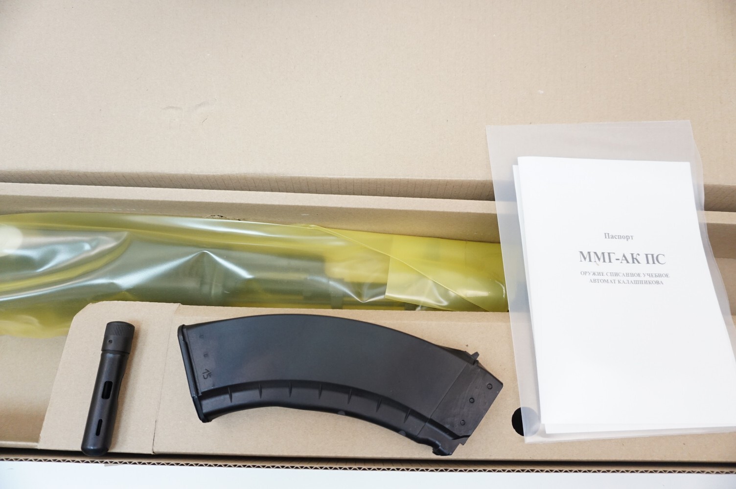 АК-103 со складным прикладом изготовлен из оружейной стали, приклад пластиковый – так же, как в боевом образце. Приклад складывается вдоль ствольной коробки слева. Длина макета с прикладом составляет 94 см, весит автомат 3,3 кг. В комплект входит макет магазина на 30 боеприпасов.