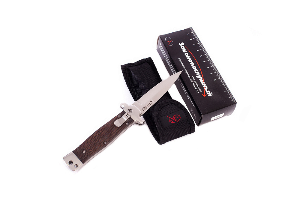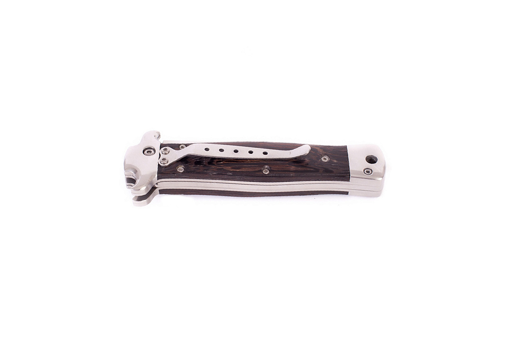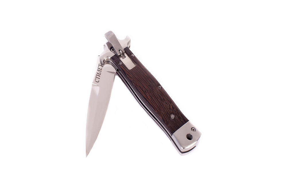 Автоматический нож с боковым выбросом клинка. Клинок копьевидной формы с односторонней заточкой.