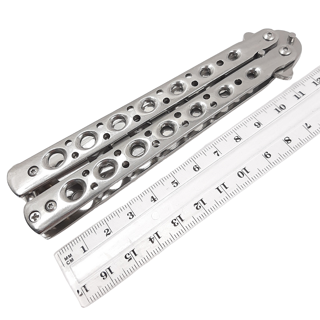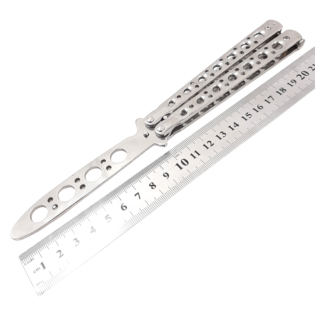 Тренировочный нож-бабочка - это специальное безопасное орудие для новичков во флиппинге. Механизм складывания балисонга для тренировок полностью идентичен стандартному острому изделию, отличает конструкцию лишь закругленное тупое лезвие. Безопасный тренировочный балисонг исключает риск травматизма при отработке трюков и разработке подвижности пальцев. Его вес немного меньше заточенного снаряда, а габариты слегка увеличены.