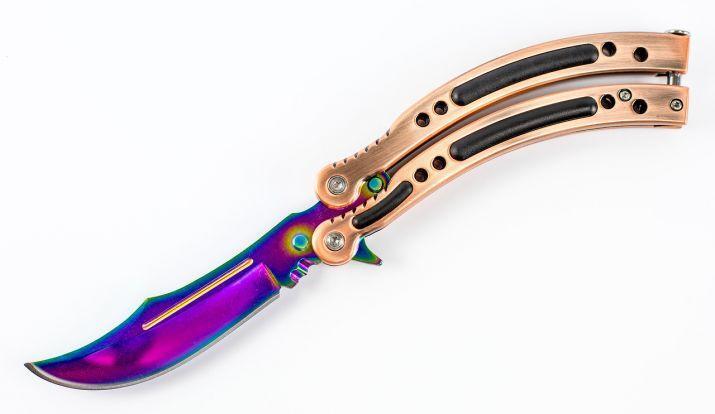 Универсальный городской нож-бабочка CS GO, о котором смело можно сказать, что он мастер на все руки. Балисонг КС ГО выполнен в стилистике ножей бабочек, которые в последнее время становятся все более популярными. К интересным особенностям этой модели можно отнести изогнутую металлическую рукоять и кольцо для пальца, расположенное на пятке клинка. На кольцо стоит обратить отдельное внимание. При использовании ножа, указательный палец размещается в кольце. Такой нож невозможно выбить из руки. Геометрия клинка позволяет использовать нож флиппинга в качестве туристического.