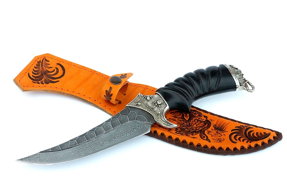 Нож Корсар дам.ст, литье скорпион, резная рукоять из ценных пород - стильный нож с клинком необычной формы, изготовленным из дамасской стали, и рукоятью, выполненной из высококачественных ценных пород древесины. Общая длина ножа составляет 276 мм, из нее длина клинка - 153 мм, длина рукояти 123 мм. Ширина клинка 38,1 мм, толщина клинка 3,7 мм. Толщина рукояти 22,7 мм. Твердость клинка 62 HRC.