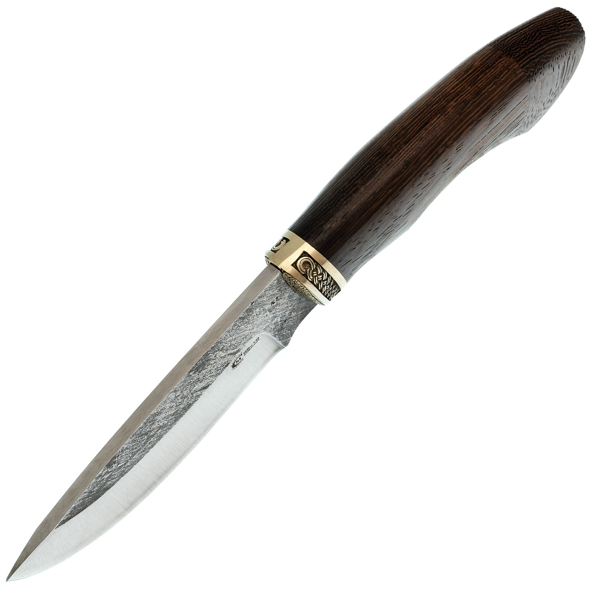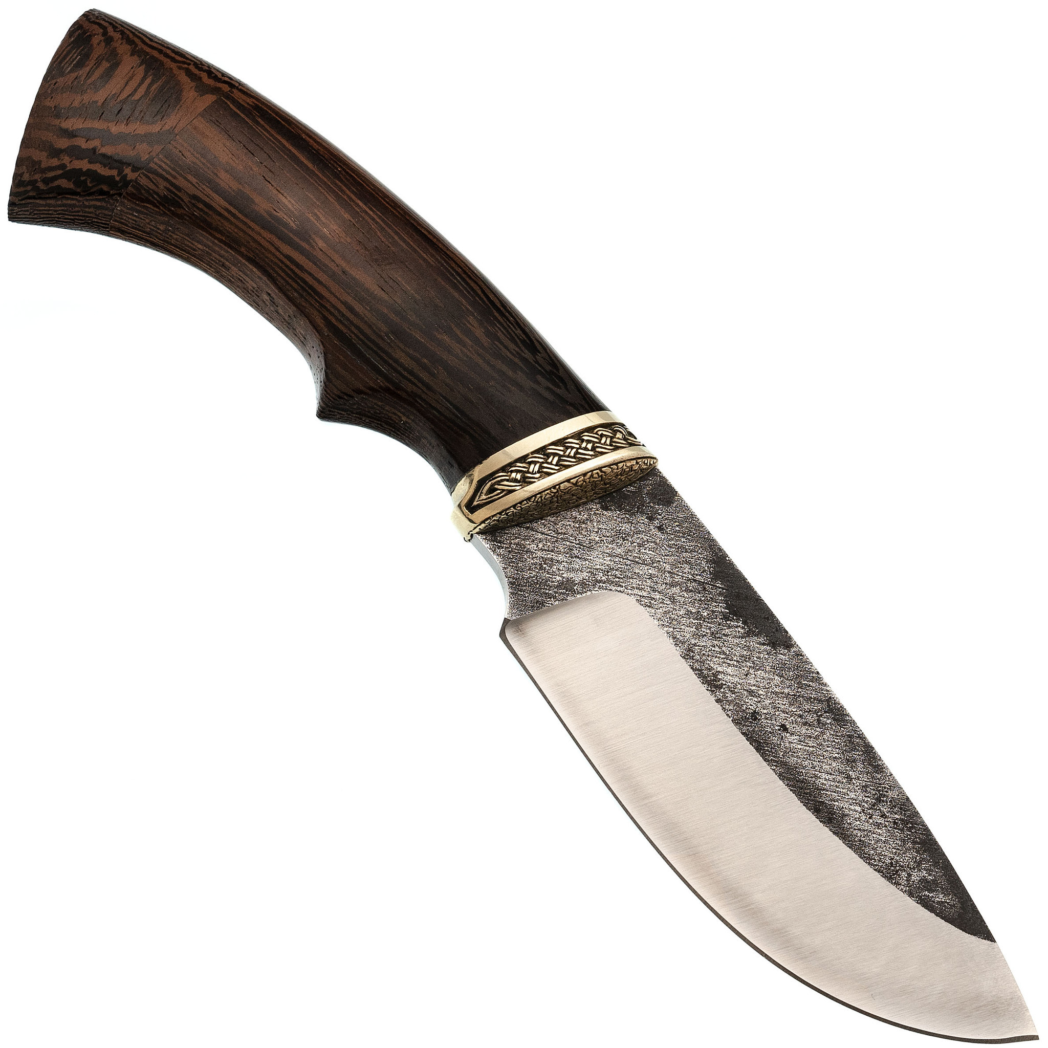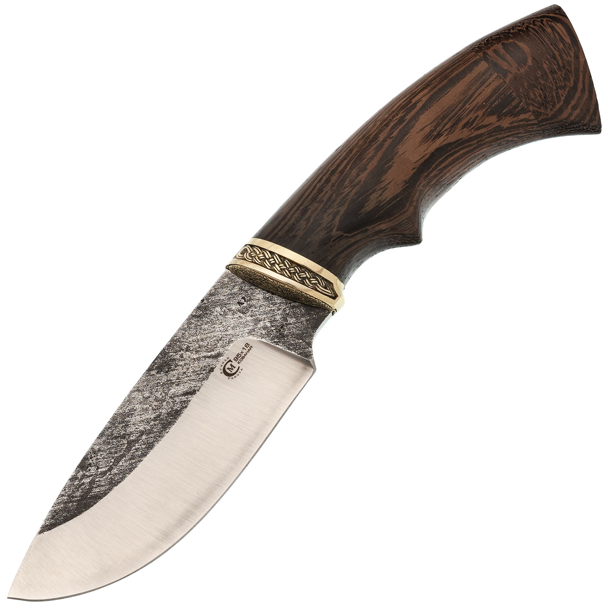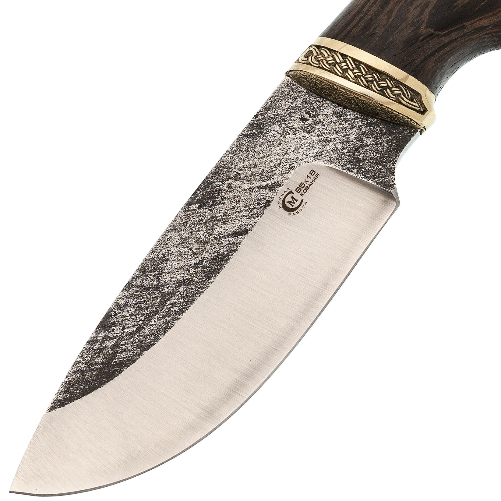 Клинок изготовлен из высококачественной стали 95Х18, что обеспечивает оптимальное сочетание коррозионной стойкости и прочности. Такая сталь легко затачивается даже в полевых условиях, что важно для поддержания ножа в рабочем состоянии. Высокие прямые спуски и широкая форма клинка обеспечивают отличную режущую способность, позволяя легко и эффективно выполнять разделочные работы. Следы ковки на поверхности придают ножу уникальный, слегка брутальный внешний вид.