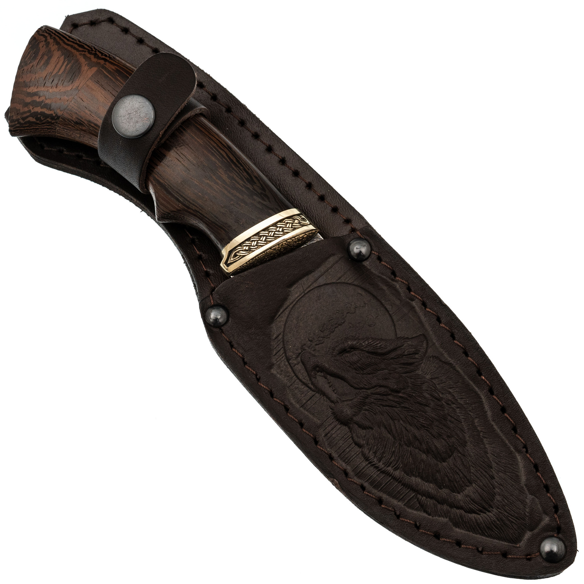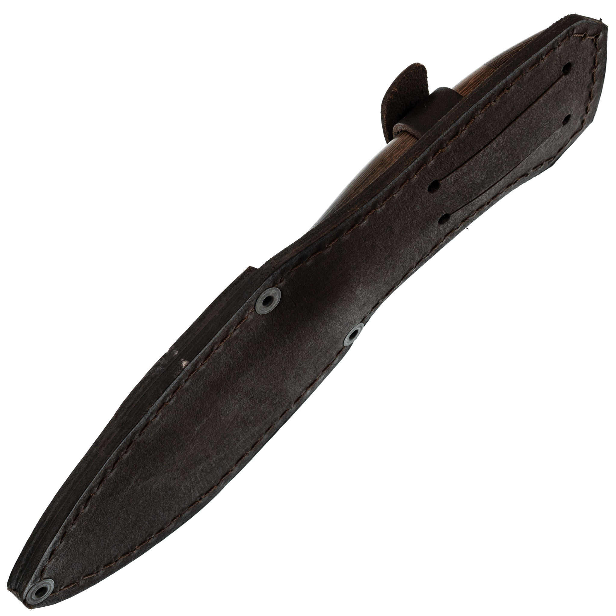 Ножны, выполненные из натуральной кожи, надежно фиксируют нож благодаря погружной конструкции. Жесткий подвес обеспечивает удобство ношения и быстрый доступ к ножу.