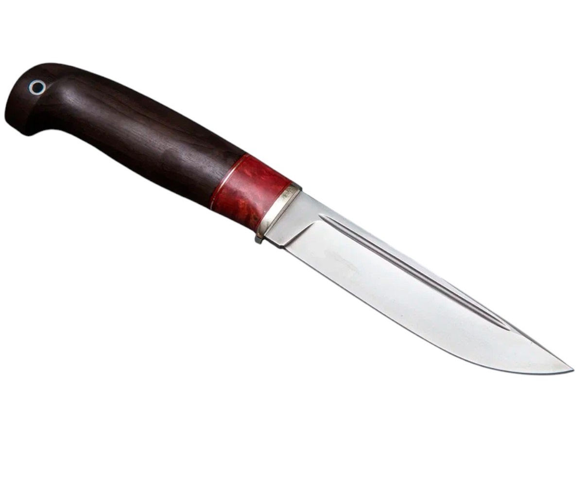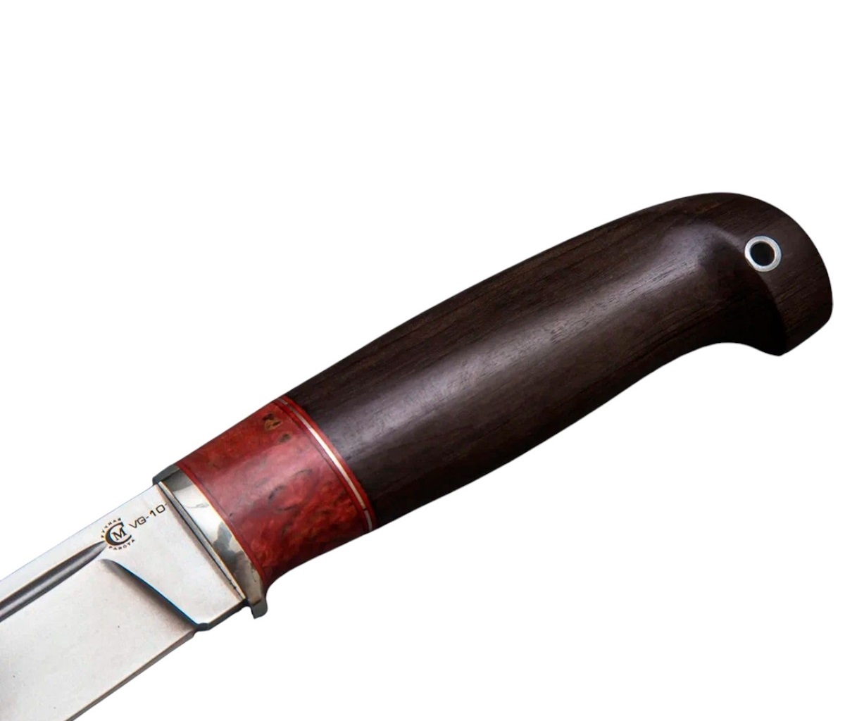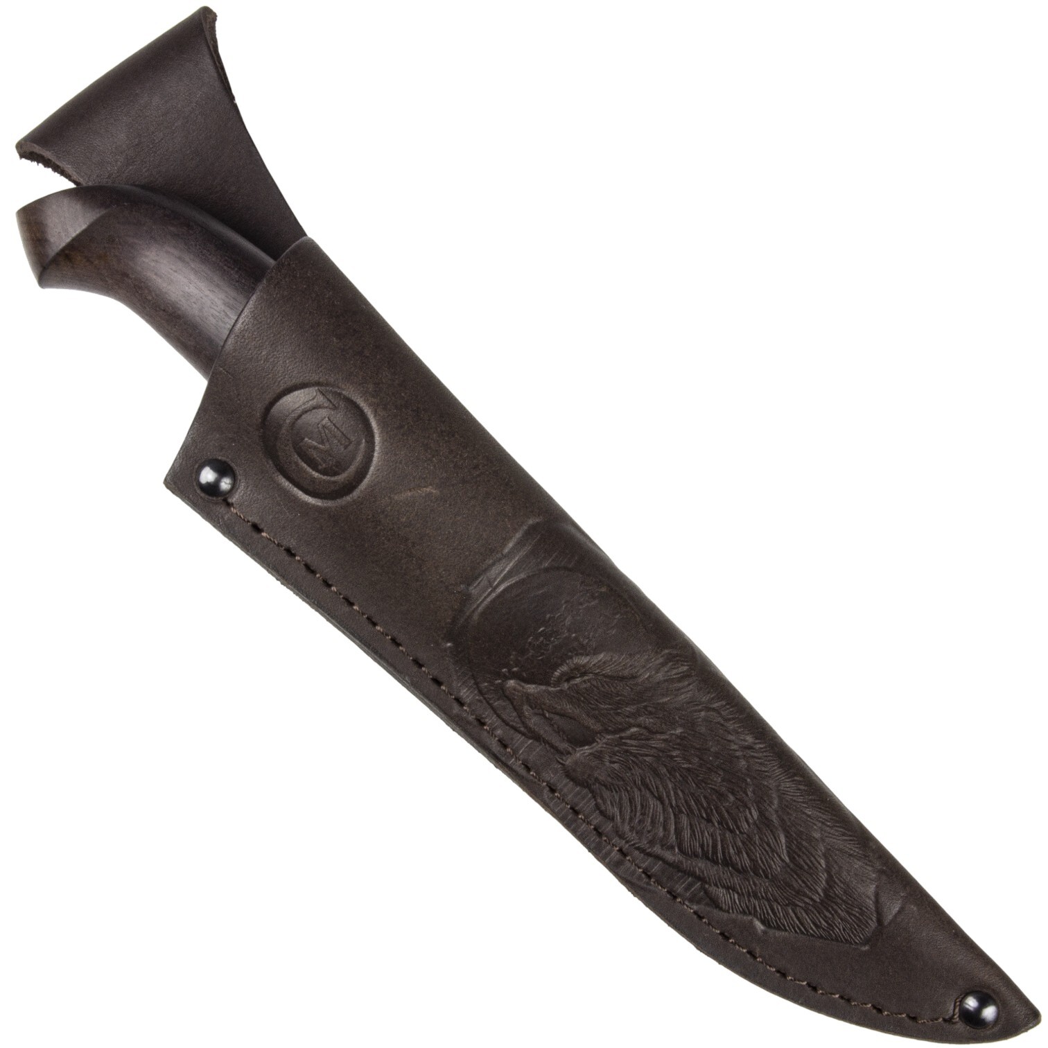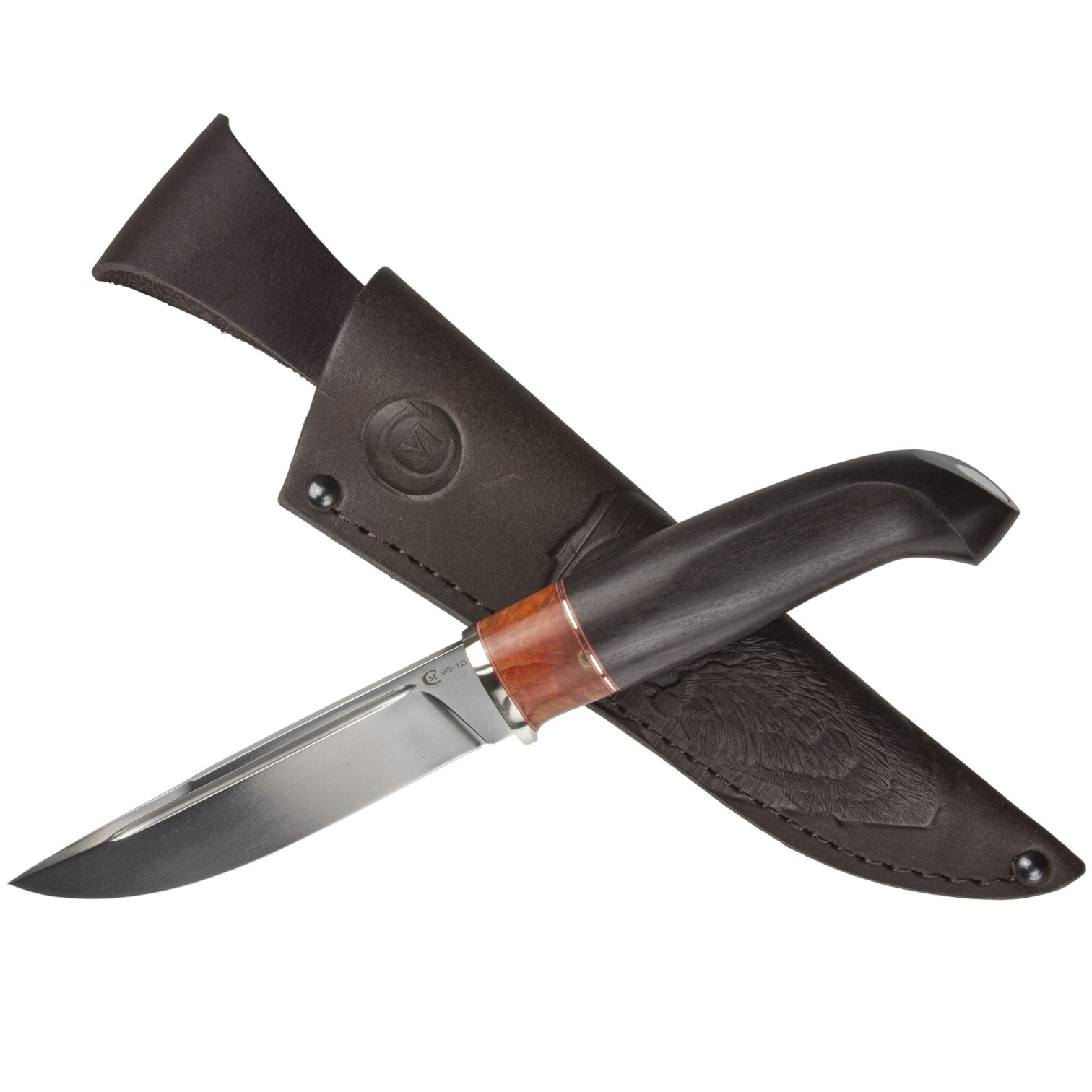 Элегантная рукоять из стабилизированной карельской берёзы и черного дерева не только придаёт ножу изысканный вид, но и обеспечивает комфортный и надёжный хват. Украшение из мельхиора добавляет изделию нотку роскоши и уникальности.