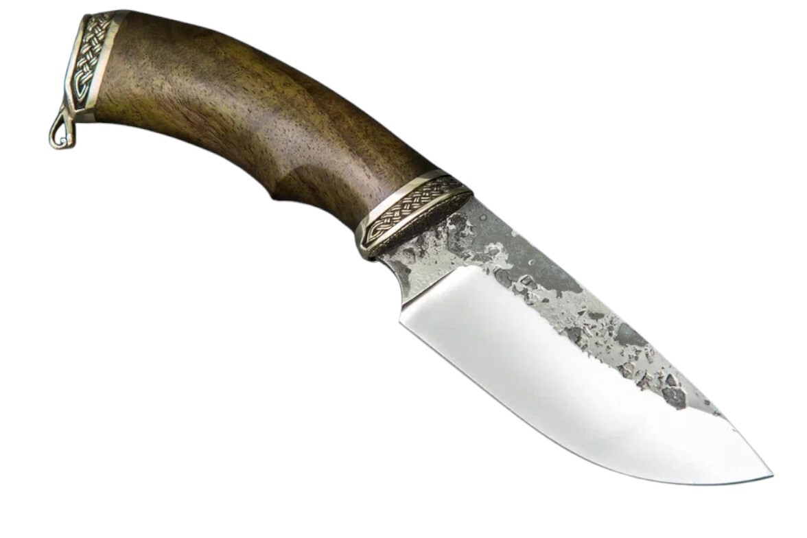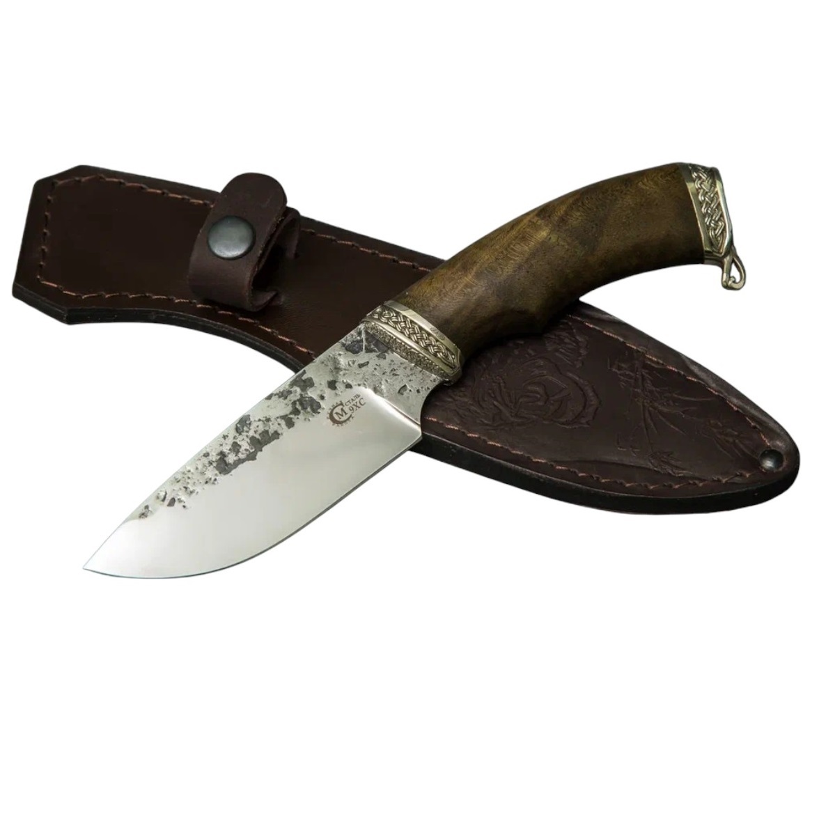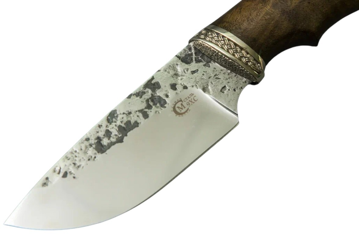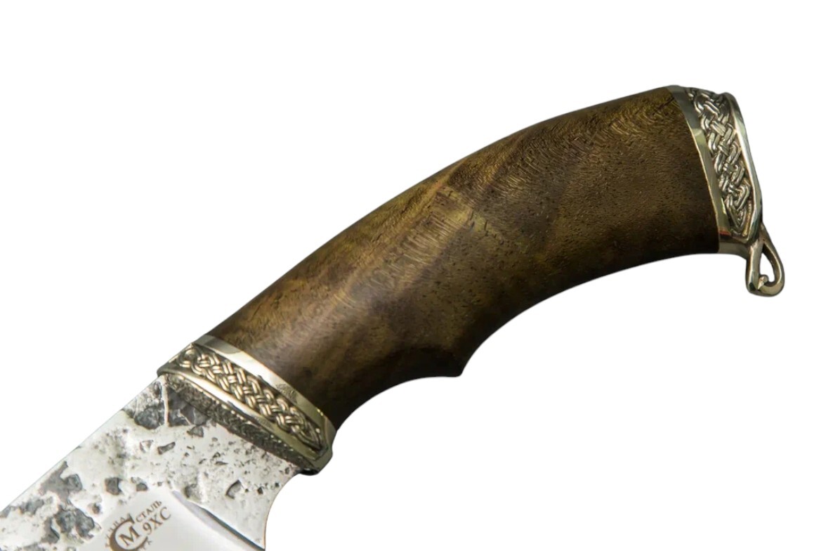 Нож Разделочный сделанный вручную мастерами кузницы Сёмина из города Ворсма, Нижегородской области. При ковке клинка использовалась Сталь 9ХС, с твердостью которая составляет 60 - 62 HRC (Чем выше показатель, тем надежнее и долговечнее нож). При производстве рукоятки используется литье мельхиор, ценные породы древесины.