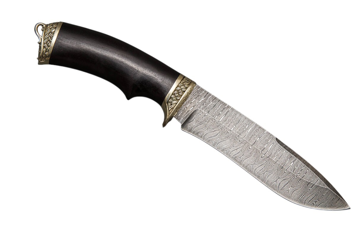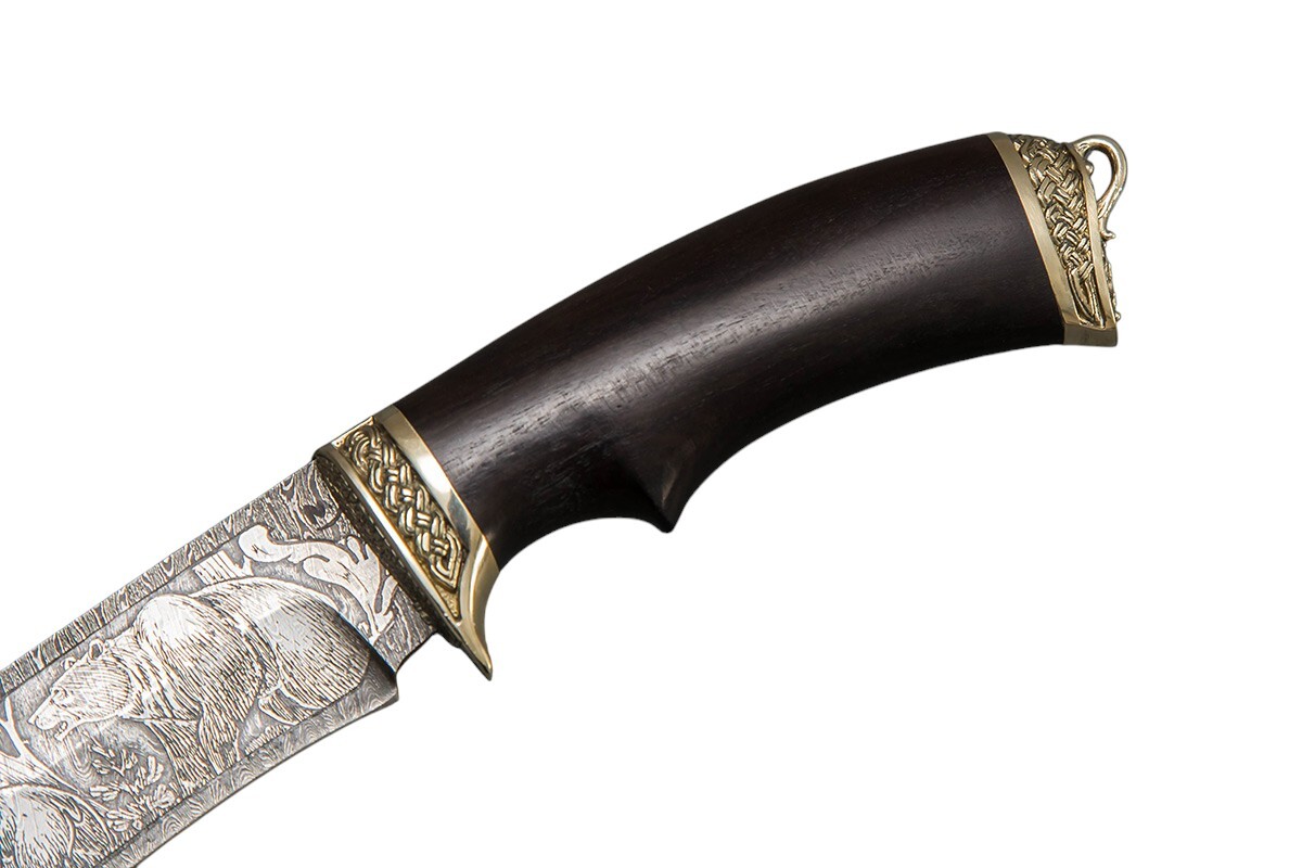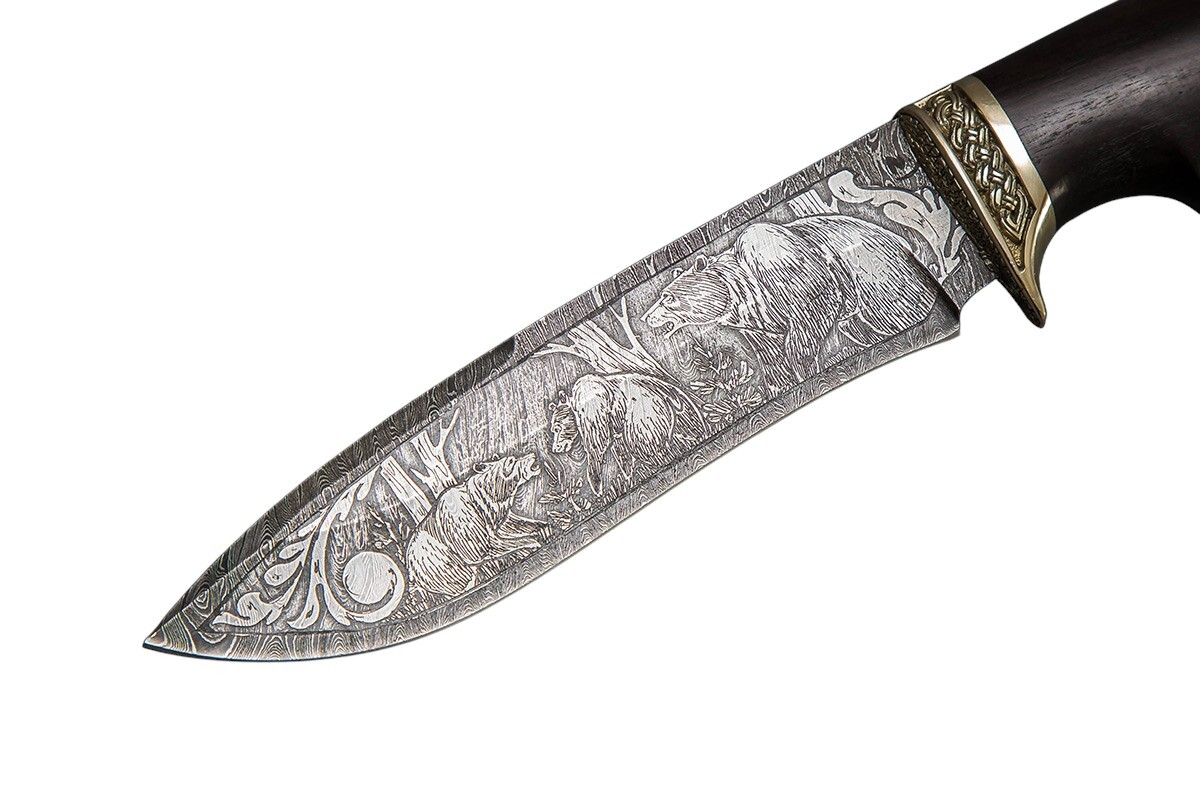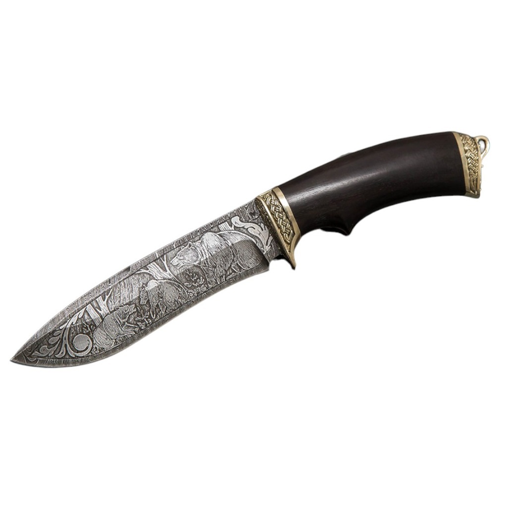 Нож Скиф с гравировкой сделанный вручную мастерами кузницы Сёмина из города Ворсма, Нижегородской области. При изготовлении клинка использовалась Дамасская сталь, с твердостью которая составляет 59 - 62 HRC.