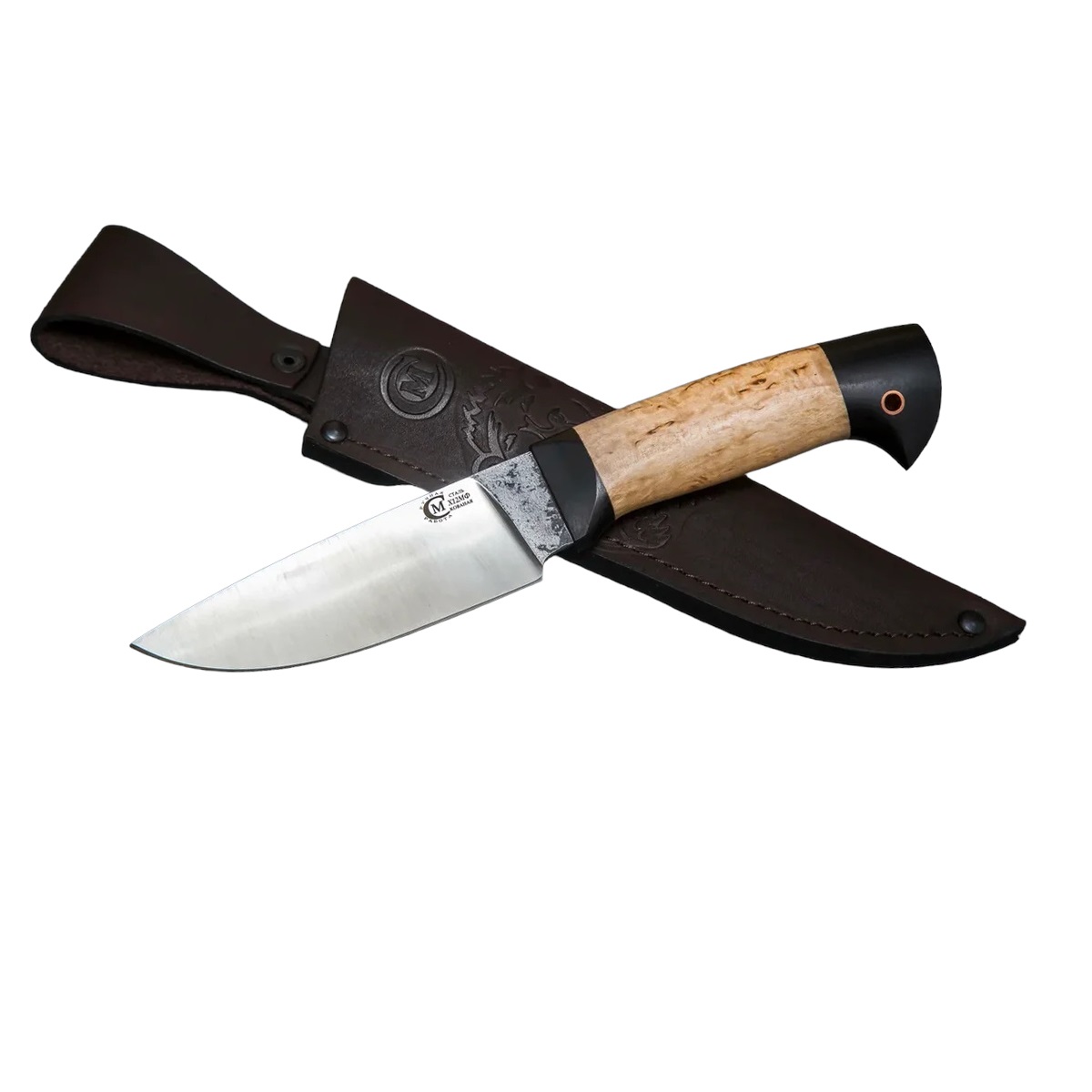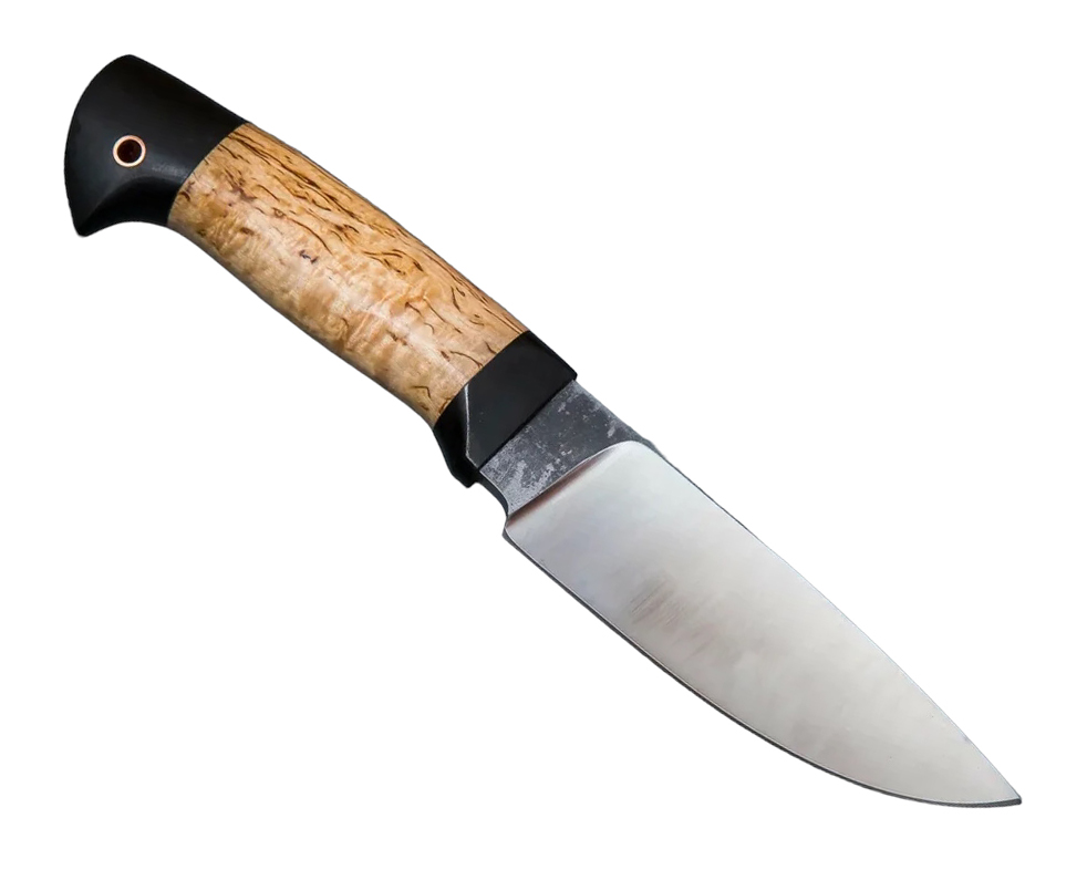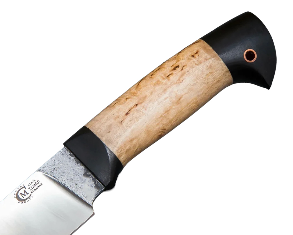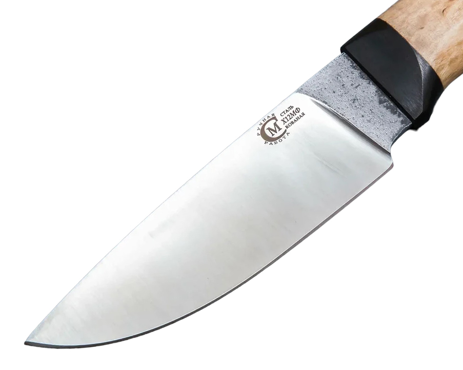 Нож Сокол сделанный вручную мастерами кузницы Сёмина из города Ворсма. При ковке клинка использовалась сталь х12мф, твердость которой составляет 60 - 62 HRC. Для изготовления рукояти используется карельская береза, черный граб.