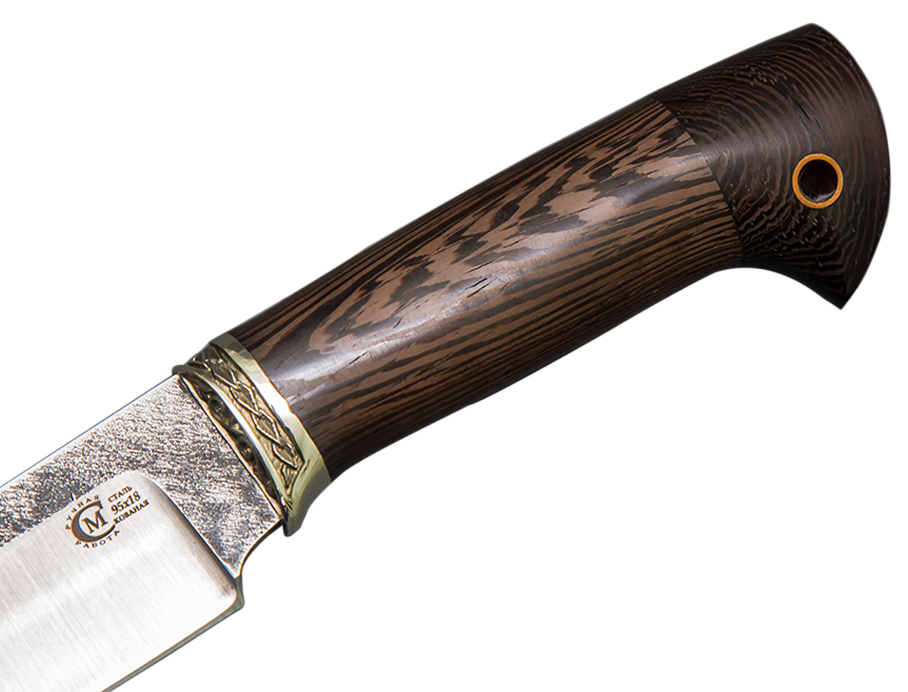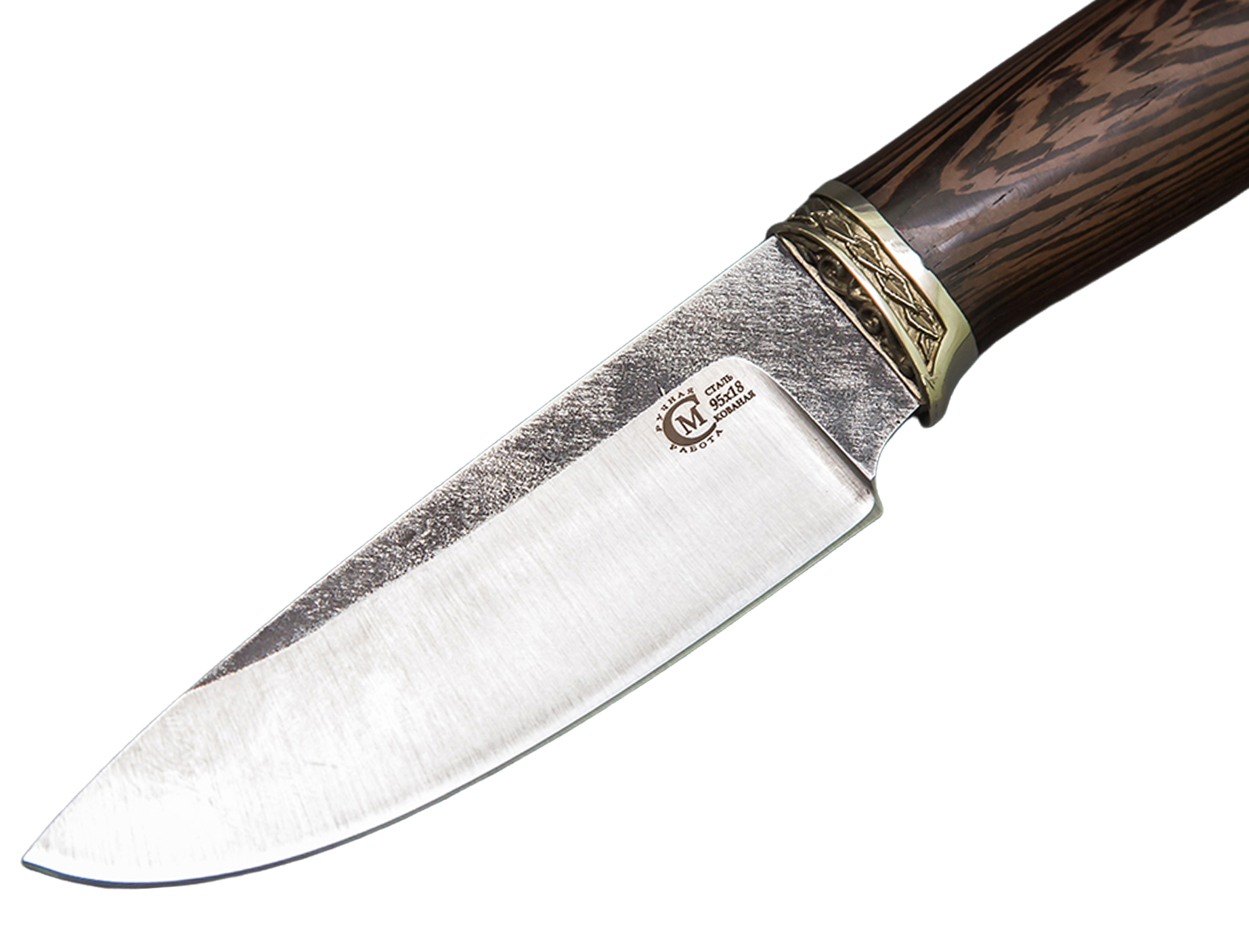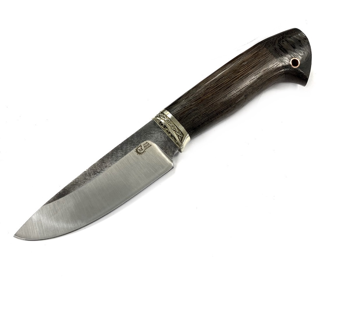 Нож Сокол сделанный вручную мастерами кузницы Сёмина из города Ворсма, Нижегородской области. При изготовлении клинка использовалась сталь 95х18 со следами ковки, с твердостью которая составляет 57 - 60 HRC (Чем выше показатель, тем надежнее и долговечнее нож). При производстве рукоятки используется литье мельхиор, венге.
