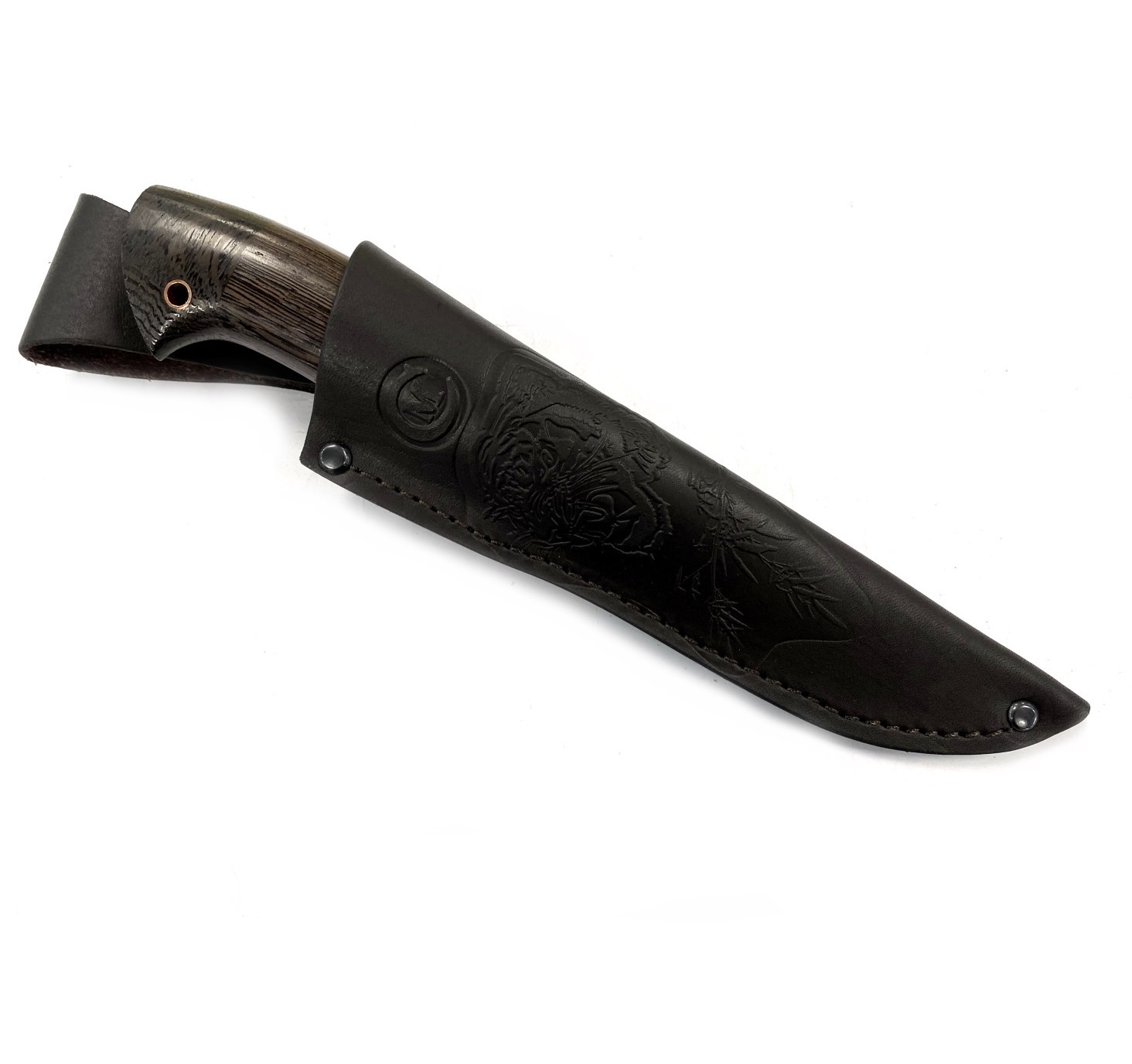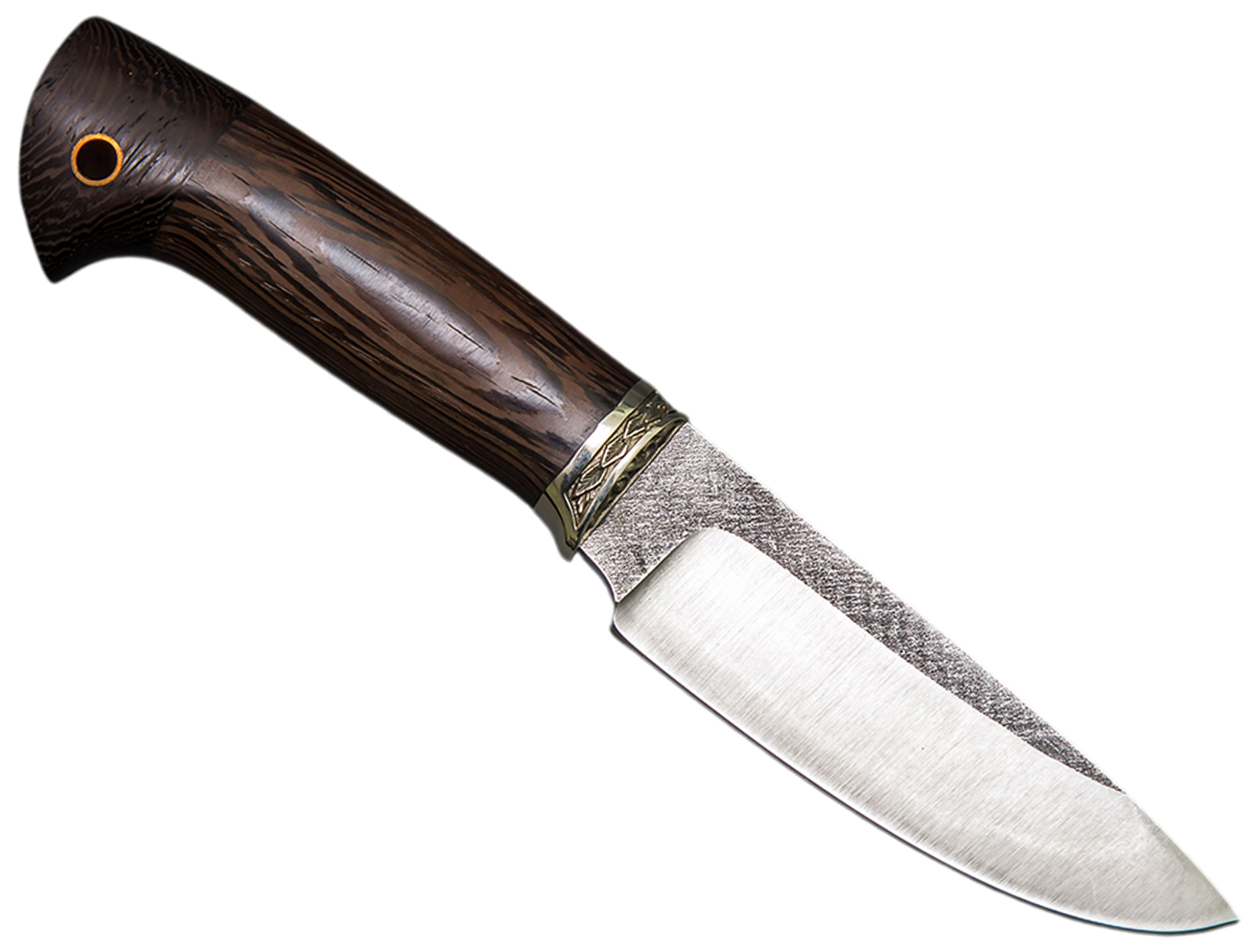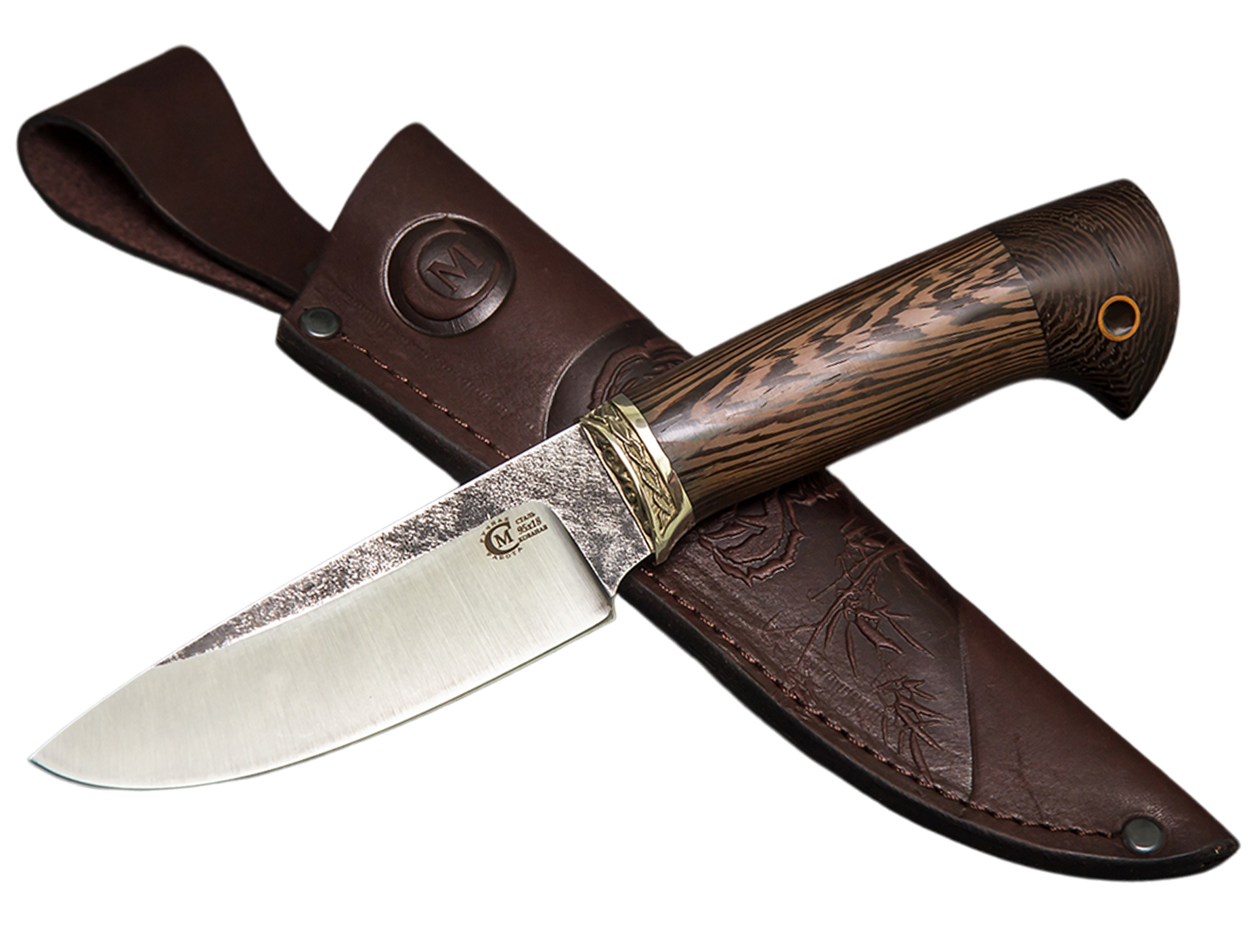 Нож Сокол сделанный вручную мастерами кузницы Сёмина из города Ворсма, Нижегородской области. При изготовлении клинка использовалась сталь 95х18 со следами ковки, с твердостью которая составляет 57 - 60 HRC (Чем выше показатель, тем надежнее и долговечнее нож). При производстве рукоятки используется литье мельхиор, венге.