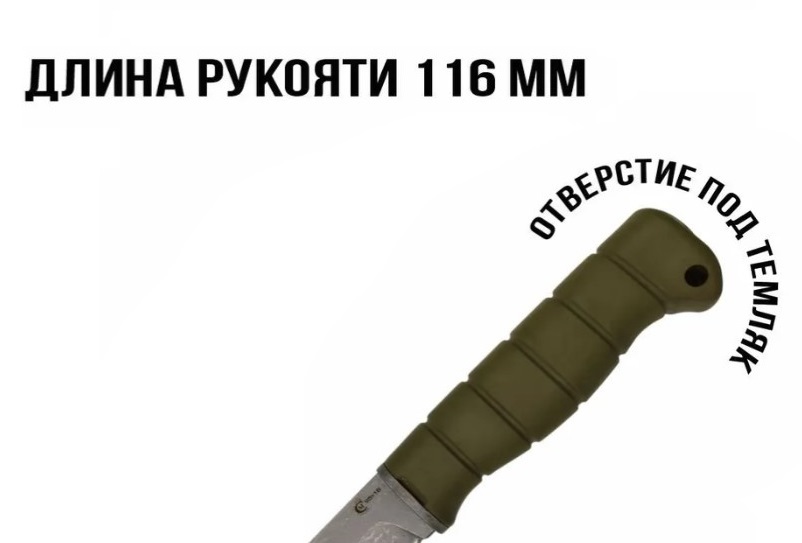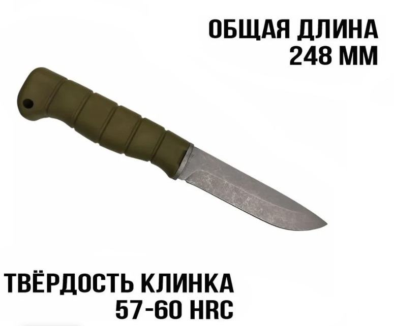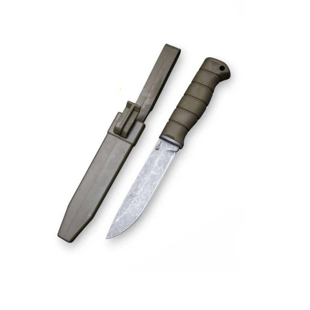 Рукоять эластрон с насечками обеспечивает надежный хват. В комплект входят пластиковые ножны, в нижней части которых есть дренажное отверстие и отверстие под темляк. Удобное крепление позволяет закрепить нож на ремне, сумке или рюкзаке. Такой нож подходит для любых задач — туризма, охоты и рыбалки, сбора грибов.