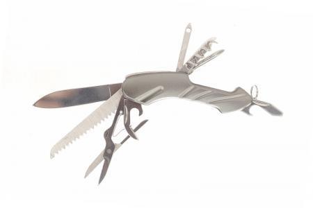 Комплектуется: ножом, пилой, ножницами, открывалкой, консервным ножом, штопором, шилом, пилкой, крестовой отвёрткой.