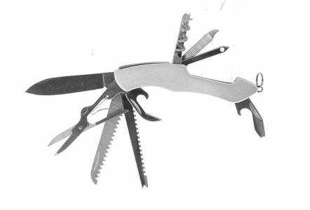 Комплектуется: ножом, открывалкой, консервным ножом, ножницами, пилой, крестовой отвёрткой, пилочкой, шилом, штопором, развёрткой, инструментом для вытаскивания крючков с рыбочисткой.