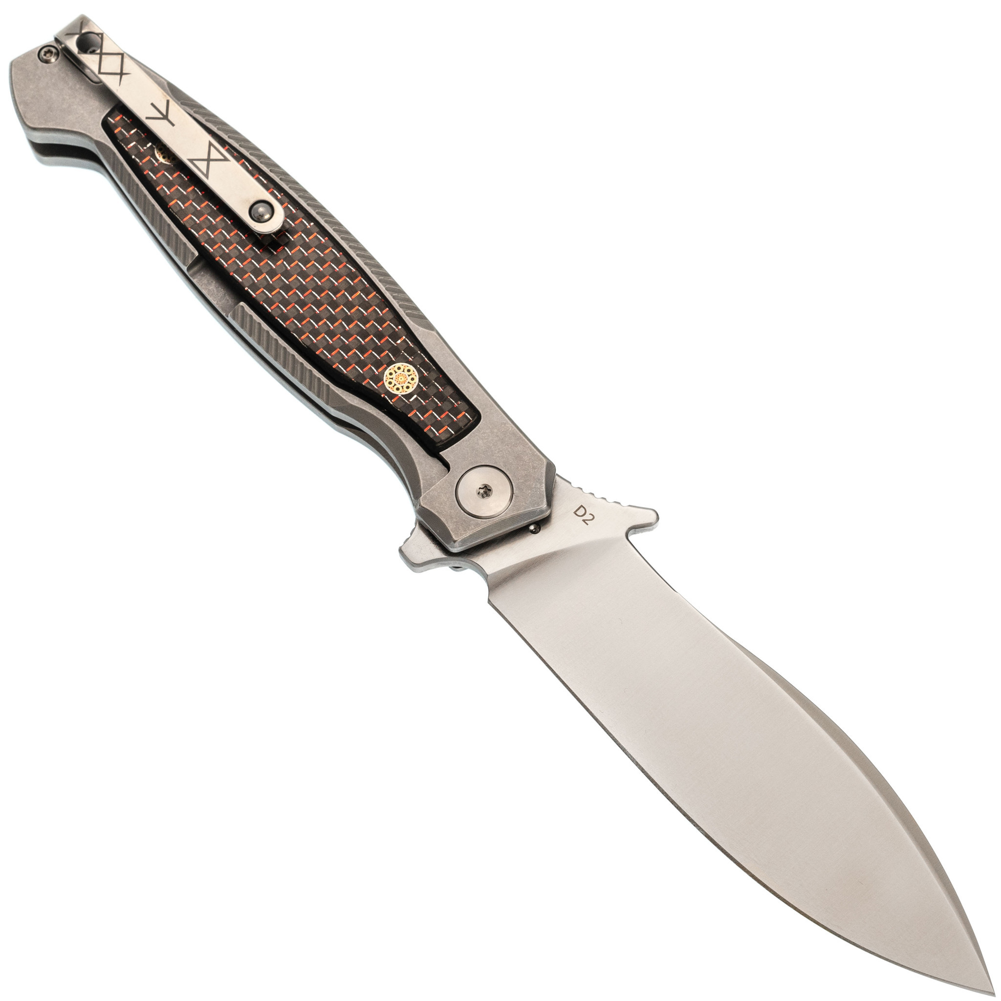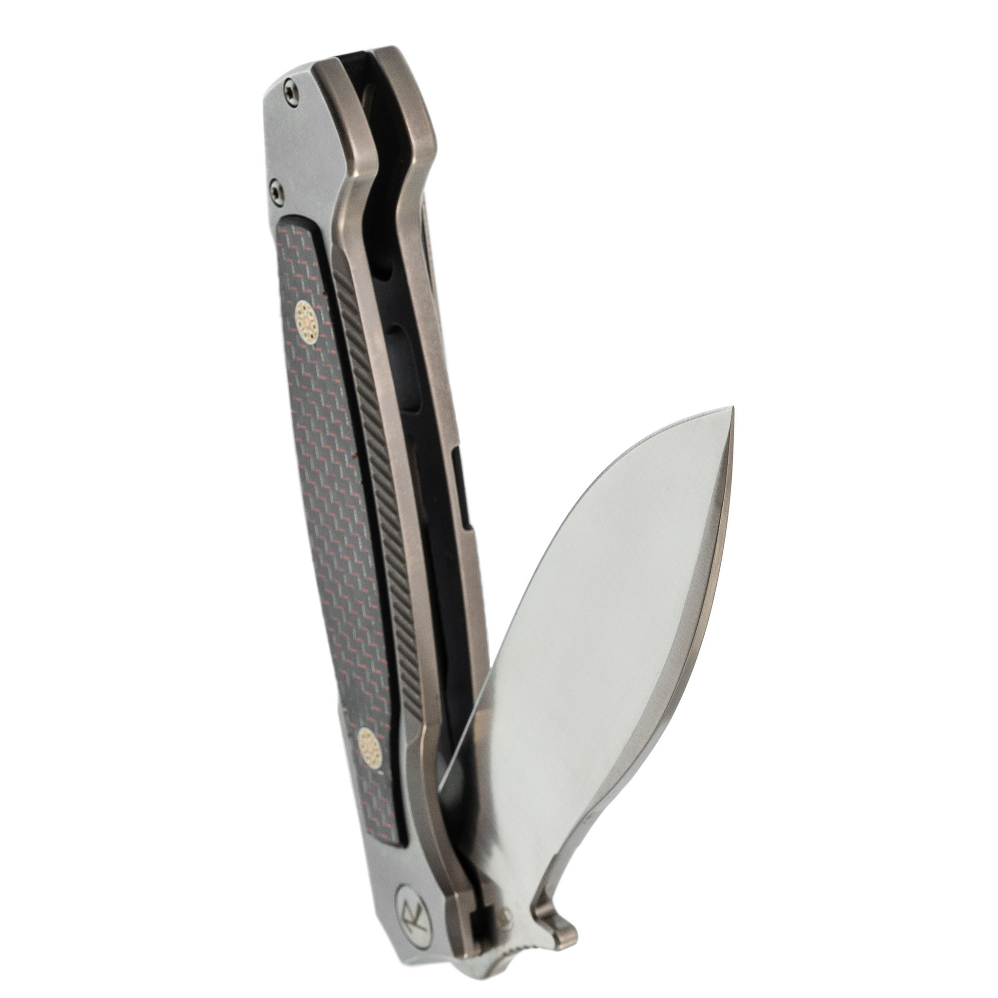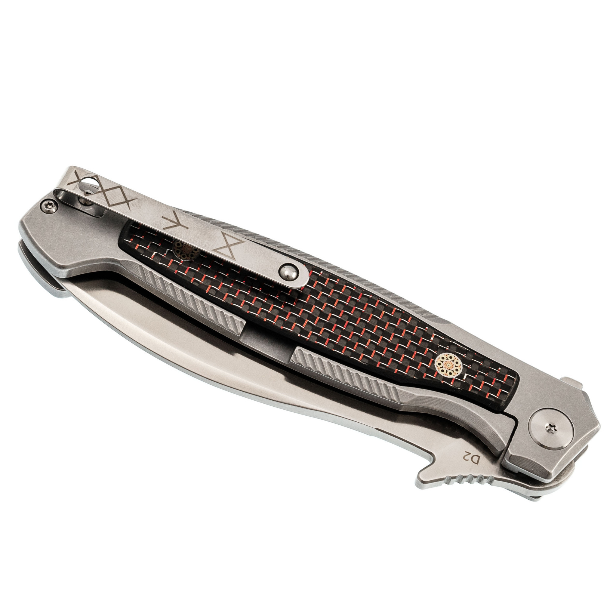 Рукоять выполнена из карбона, что обеспечивает легкость и прочность конструкции. Накладки из стеклотекстолита G10 добавляют прочности и стойкости к внешним воздействиям. Эргономичная форма рукояти гарантирует комфортный и уверенный хват.