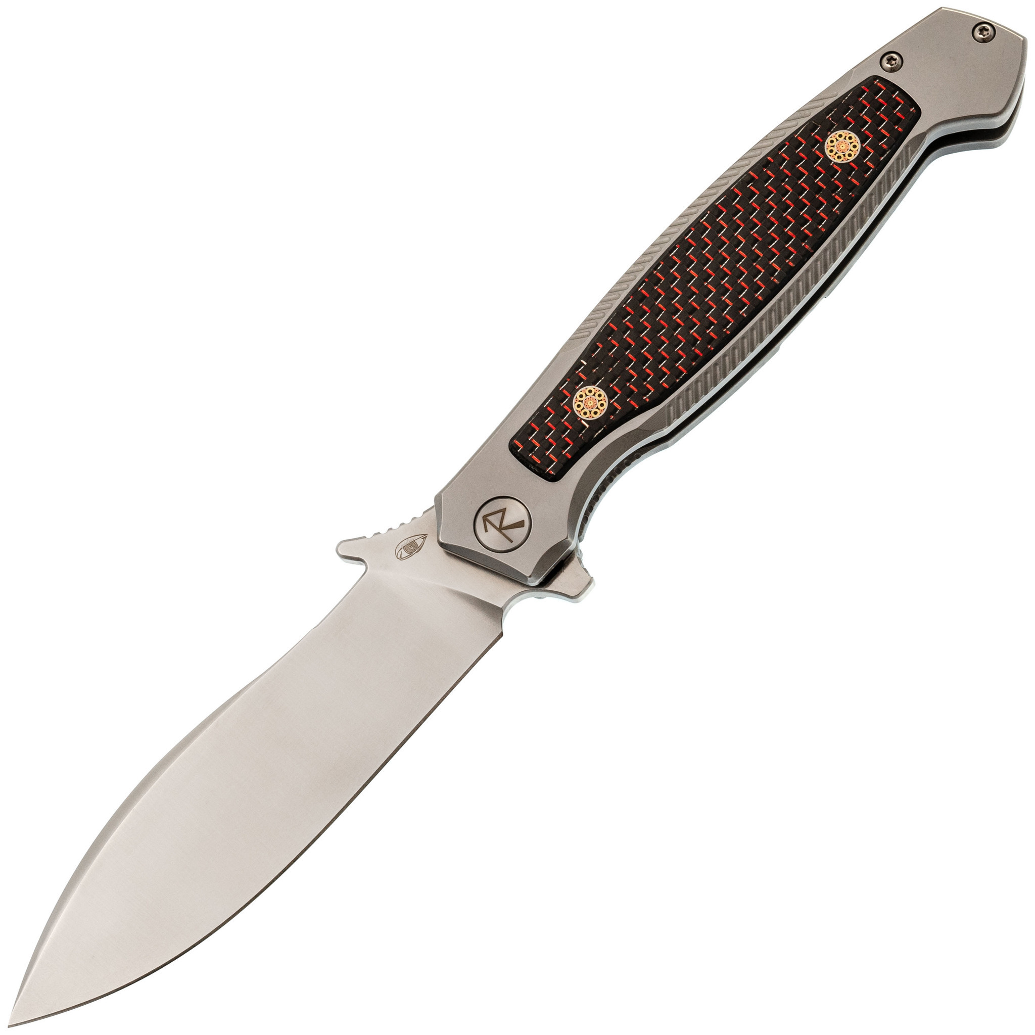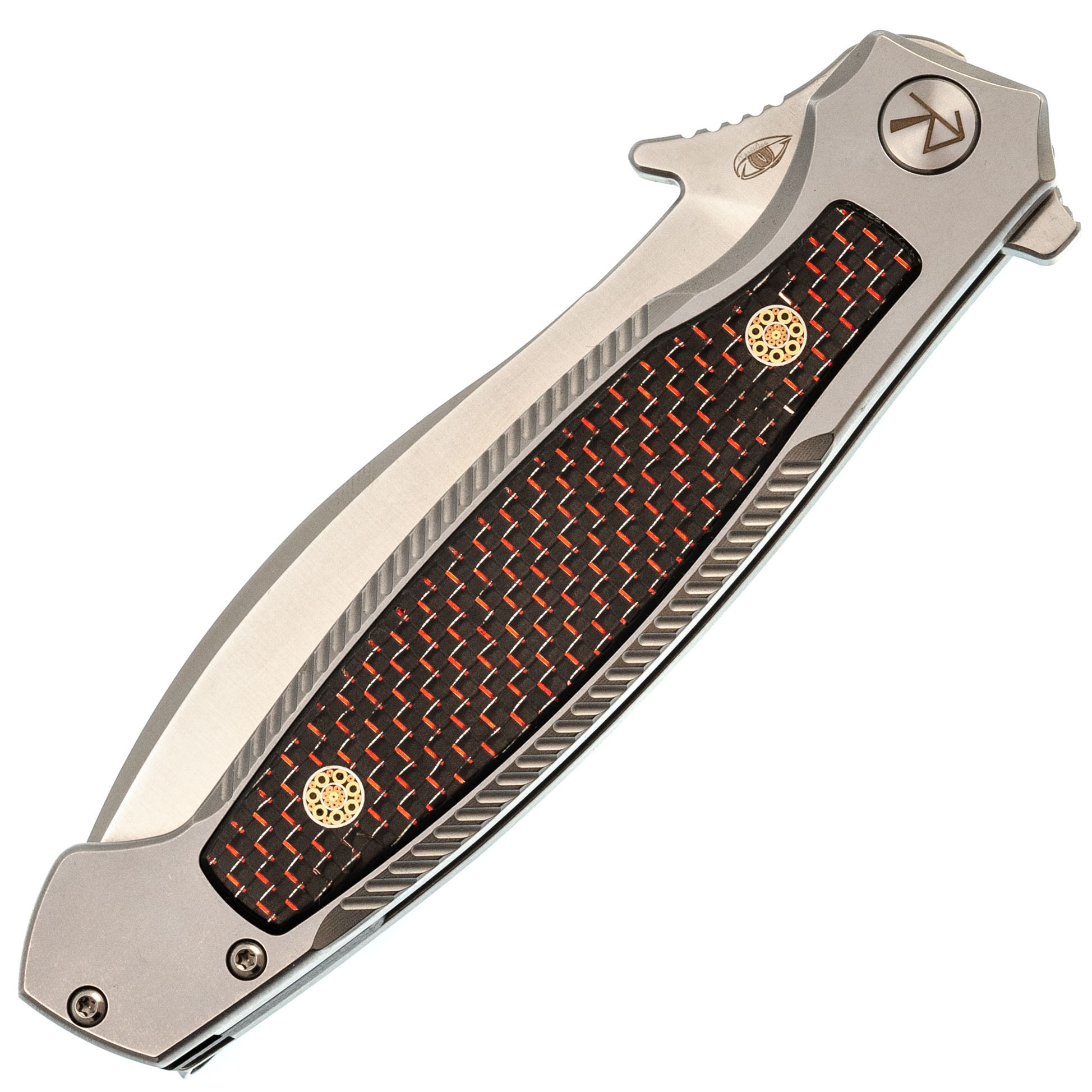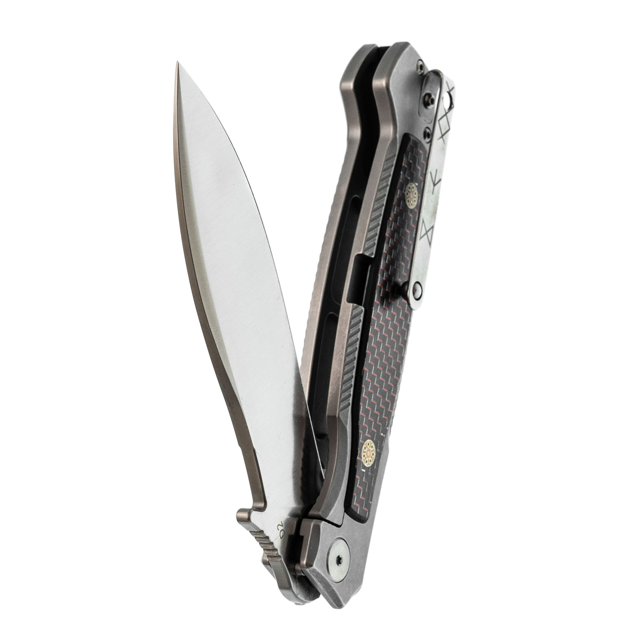 Рукоять выполнена из карбона, что обеспечивает легкость и прочность конструкции. Накладки из стеклотекстолита G10 добавляют прочности и стойкости к внешним воздействиям. Эргономичная форма рукояти гарантирует комфортный и уверенный хват.