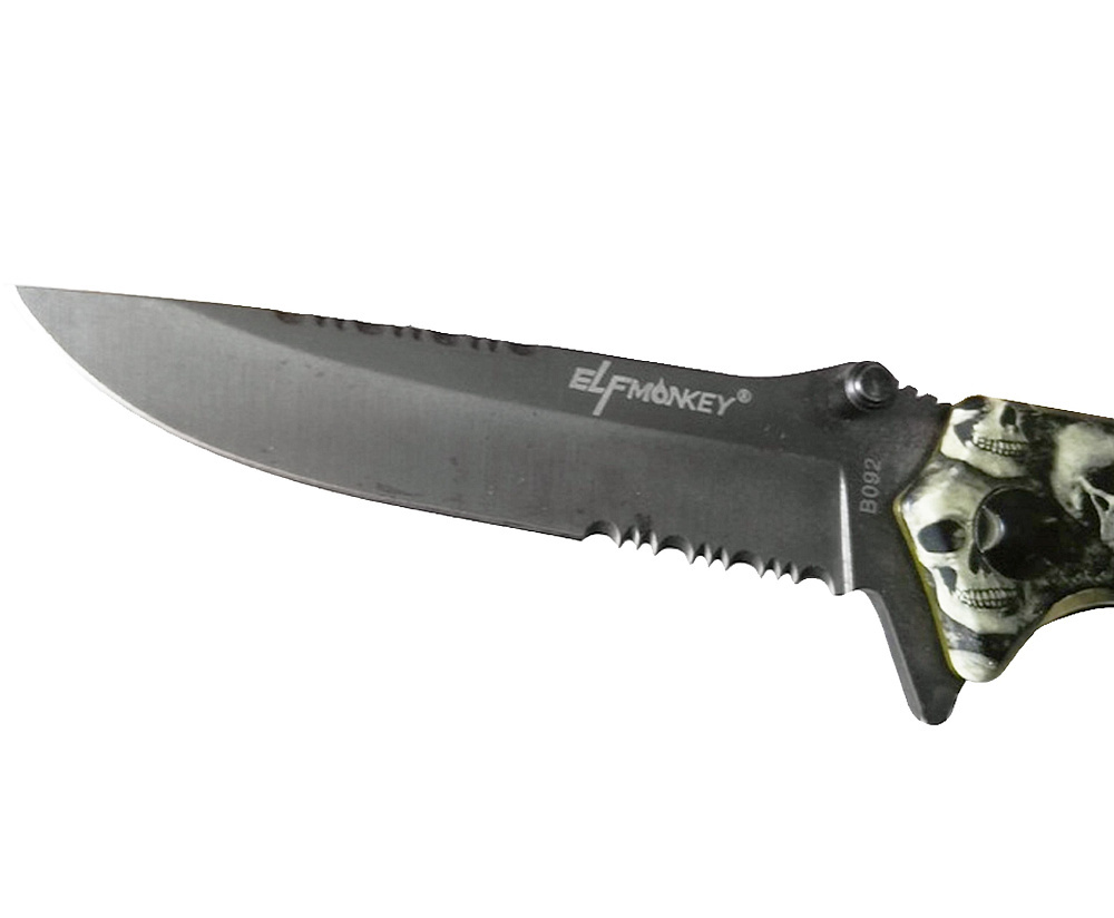Модель относится к категории EDC устройств, не относящихся к холодному оружию по ряду признаков. Базовое назначение складного ножа Elf Monkey – это выполнение повседневных задач, однако конструктивные особенности изделия намекают на возможность применения в природных диких условиях. Клинок Клип-Поинт длиной 9.5 см откован с применением нержавеющей стали 420HC с повышенным содержанием углерода и твердостью после закалки 58 единиц по шкале Роквелла. Складные EDC ножи Эльф Манки открываются одной рукой при помощи шпенька под палец, при этом клинковая часть запирается на замок Liner Lock, надежно фиксирующий инструмент в рабочем положении. Комбинированная режущая поверхность с серрейтором у основания вкупе с утолщенным 3.5 мм обухом придает ножу способность перерубать шнуры, ветки и уверенно справляться со строганием древесины.