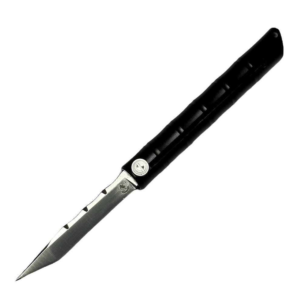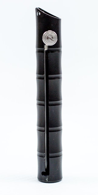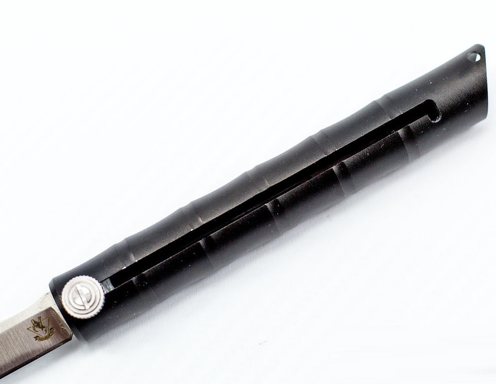 В сложенном положении клинок находится внутри полой рукояти и соединен со шпеньком снаружи. Для извлечения клинка необходимо подвинуть шпенек в прорези. Чтобы зафиксировать клинок в открытом или закрытом положении достаточно завести шпенек в поворот прорези. Данный механизм обеспечит безопасную работу с ножом и не позволит ему внезапно сложиться в процессе выполнения работ.