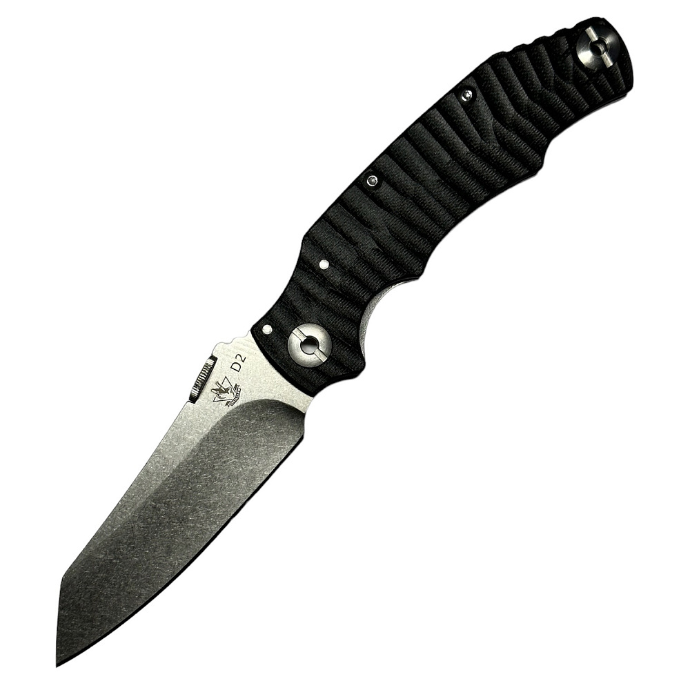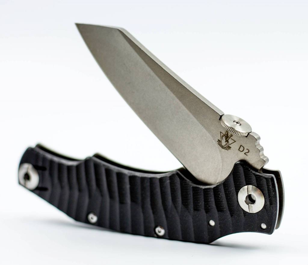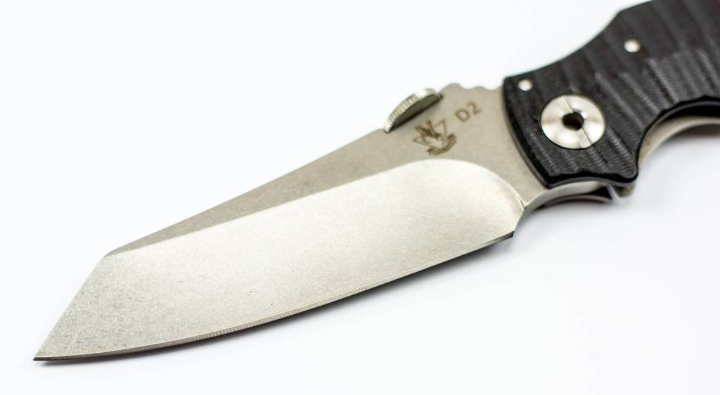 Материал клинка D2 — это одна из самых популярных ножевых сталей в мире. Она содержит 12% хрома, что не позволяет называться нержавеющей, поэтому после работы с ножом, клинок необходимо протирать насухо. Из положительных характеристик стоит так же отметить, что она хорошо держит режущую кромку острой и обладает неплохой ударной вязкостью. Спуски на клинке вогнутые. Из-за этого нож будет показывать агрессивный и хорошо контролируемый рез. При строгании он будет эффективно вгрызаться в материал. С другой стороны по сравнению с прямыми спусками, вогнутые немного хуже держат заточку.
