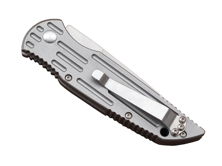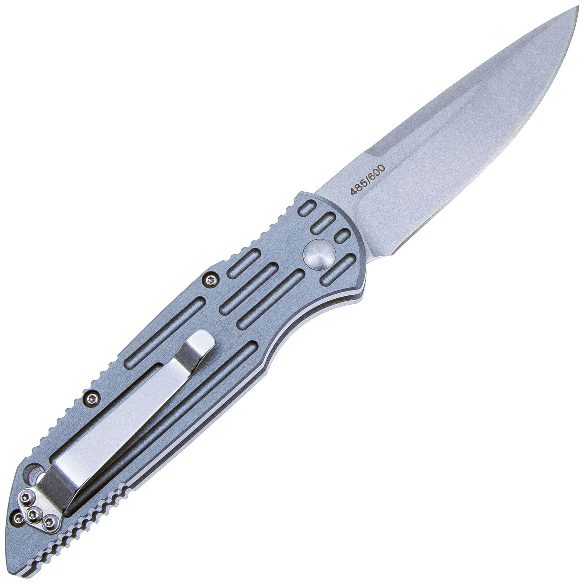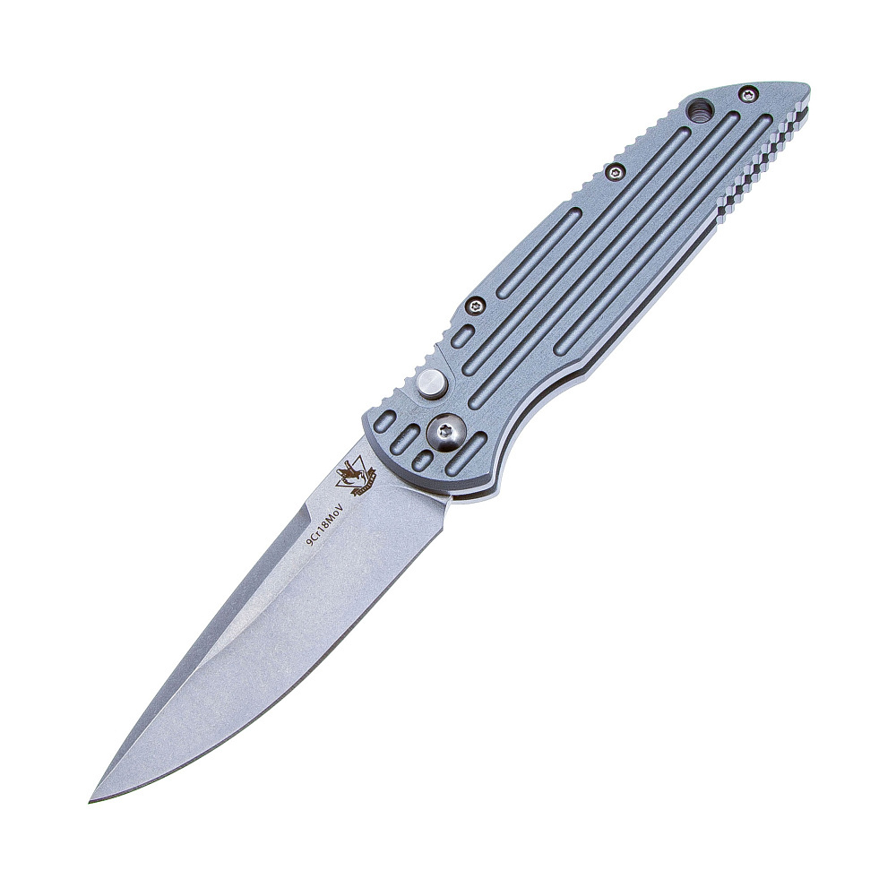 Автоматический механизм позволяет раскрыть нож одним нажатием кнопки. Она же фиксирует клинок, не позволяя ему самопроизвольно складываться. Насечки препятствуют скольжению, а наличие специальных выемок для большого и указательного пальца позволяет удобно держать нож в руке.