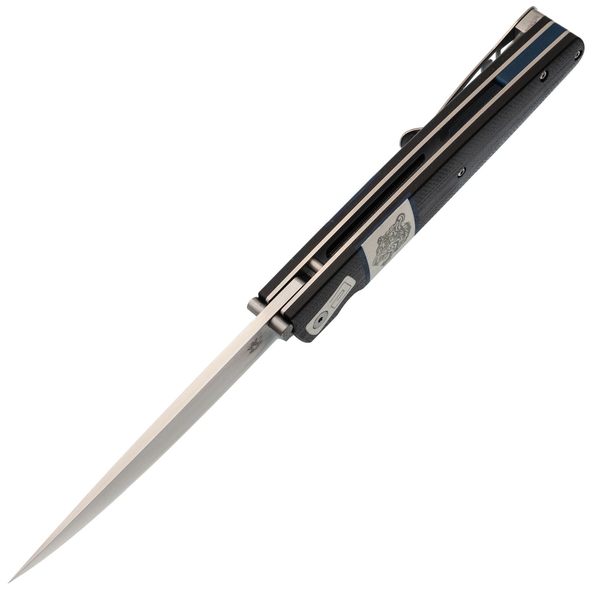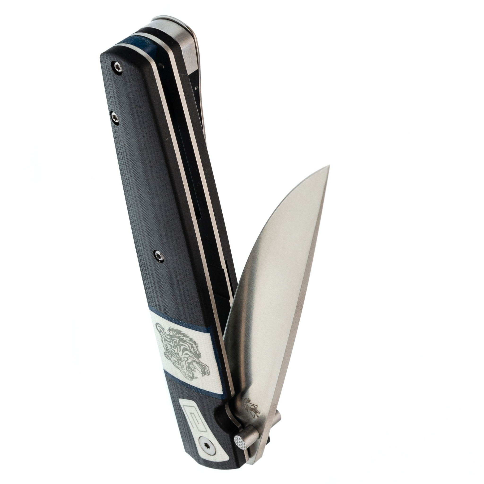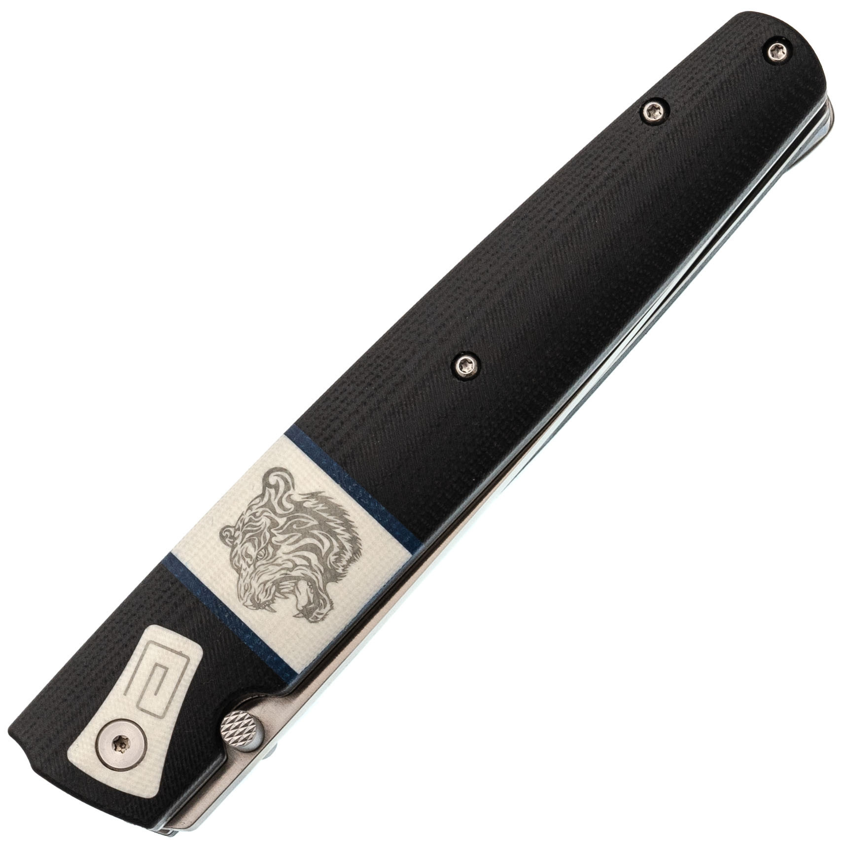 Рукоять изготовлена из прочного стеклотекстолита G10, гарантируя высокую прочность конструкции при относительно небольшом весе и минимальные требования к уходу. Элегантная декоративная вставка с изображением тигра придаёт рукояти характер и индивидуальность. Нож оснащён надёжным замком Liner-Lock – проверенным и простым в использовании механизмом, а также оборудован клипсой глубокой посадки для удобного ношения на кармане.