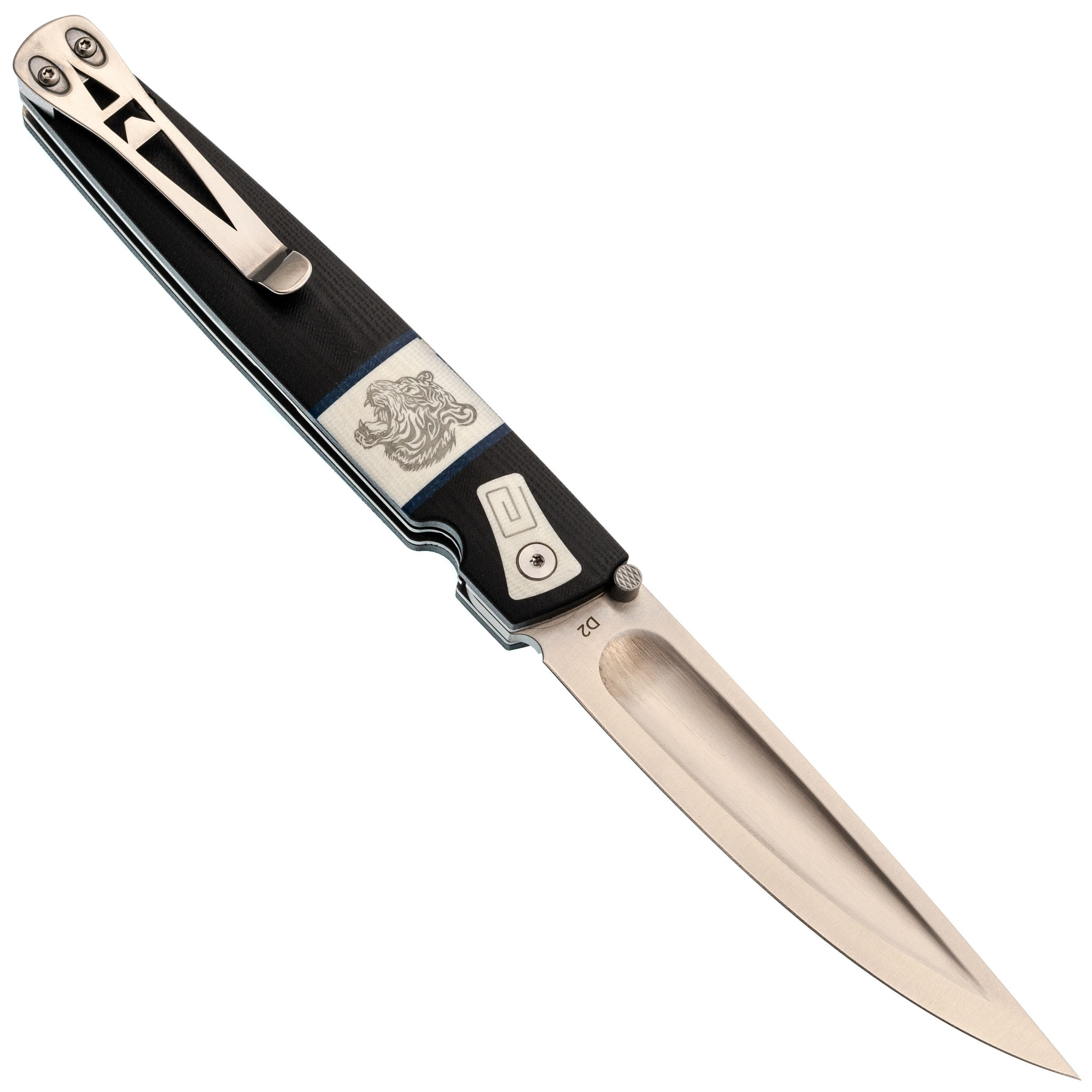 Клинок выполнен из стали D2 – высокоуглеродистой инструментальной стали, обладающей феноменальной износостойкостью, что обеспечивает длительное удержание остроты и сокращает необходимость заточки. Уникальная геометрия клинка представлена в виде плоского клинка с долом с одной стороны и выпуклой линзой с другой, что идеально подходит для обработки древесины, замороженного мяса или рыбы. Механизм открытия реализован с помощью шпеньки под каждую руку, обеспечивая быстрый и удобный доступ к лезвию.