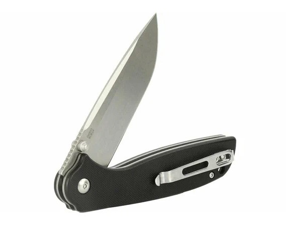 Ручка ножа сделана из стеклотекстолита G10. Это довольно крепкий материал, и он гарантирует удобство при работе с моделью, а также демонстрирует стойкость к разного рода внешним факторам. Ручка эргономичной формы, удобная при захвате. Поверхность рукояти текстурированная, благодаря чему изделие надёжно удерживается в руке при любых условиях. Металлическая клипса даёт возможность фиксировать нож, и носить его на кармане, на поясе либо прикрепить к сумке. Здесь есть отверстие для темляка.