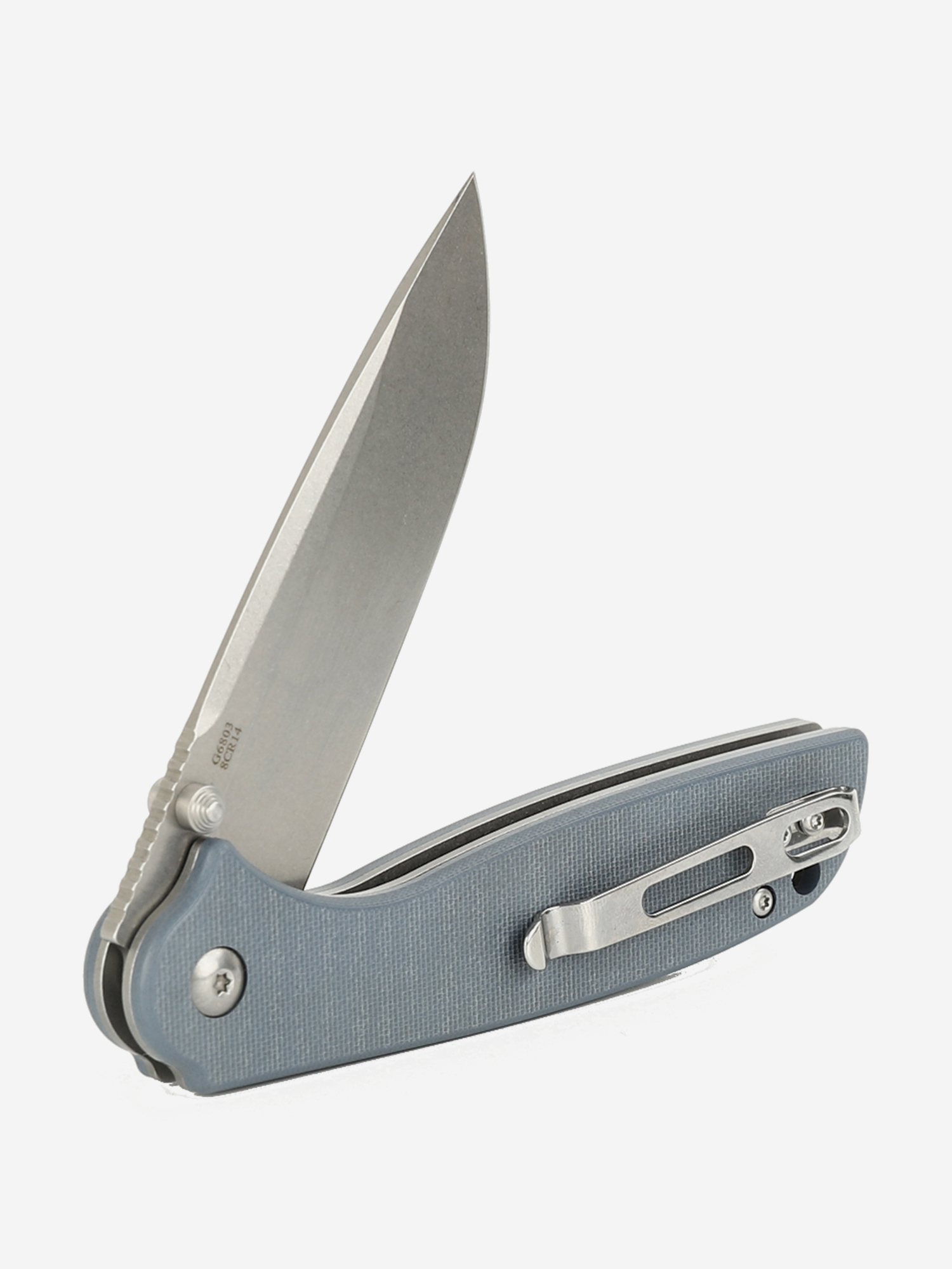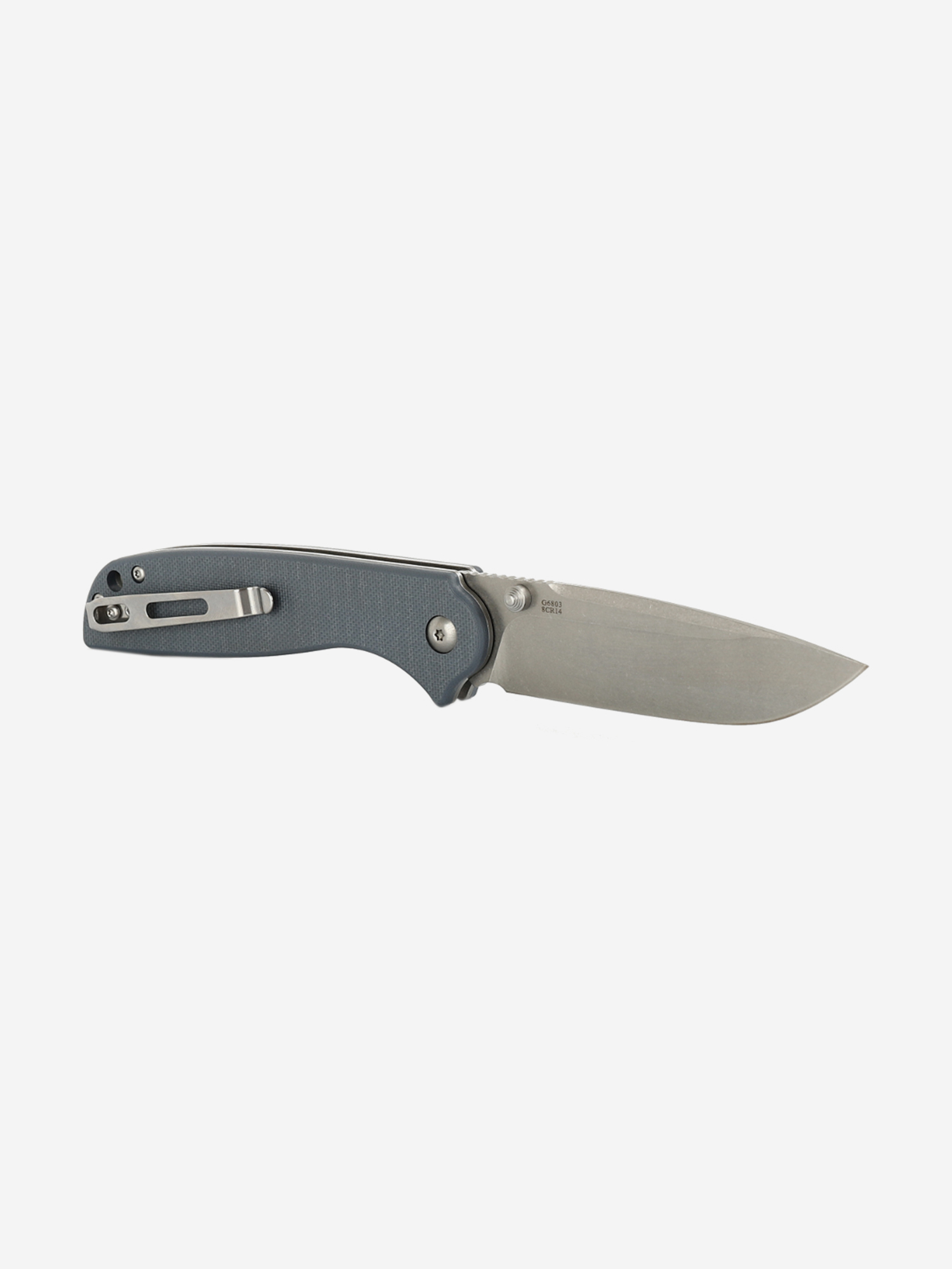 Лезвие модели выполнено из стали марки 8CR14, твердость которой составляет примерно 58 единиц по шкале Роквелла. Тип замка Liner Lock. Форма лезвия clip point. Клинок заточен гладко. Материал хорошо защищен от возникновения ржавчины. Имеются насечки на обухе для более удобного захвата и удержания ножа.