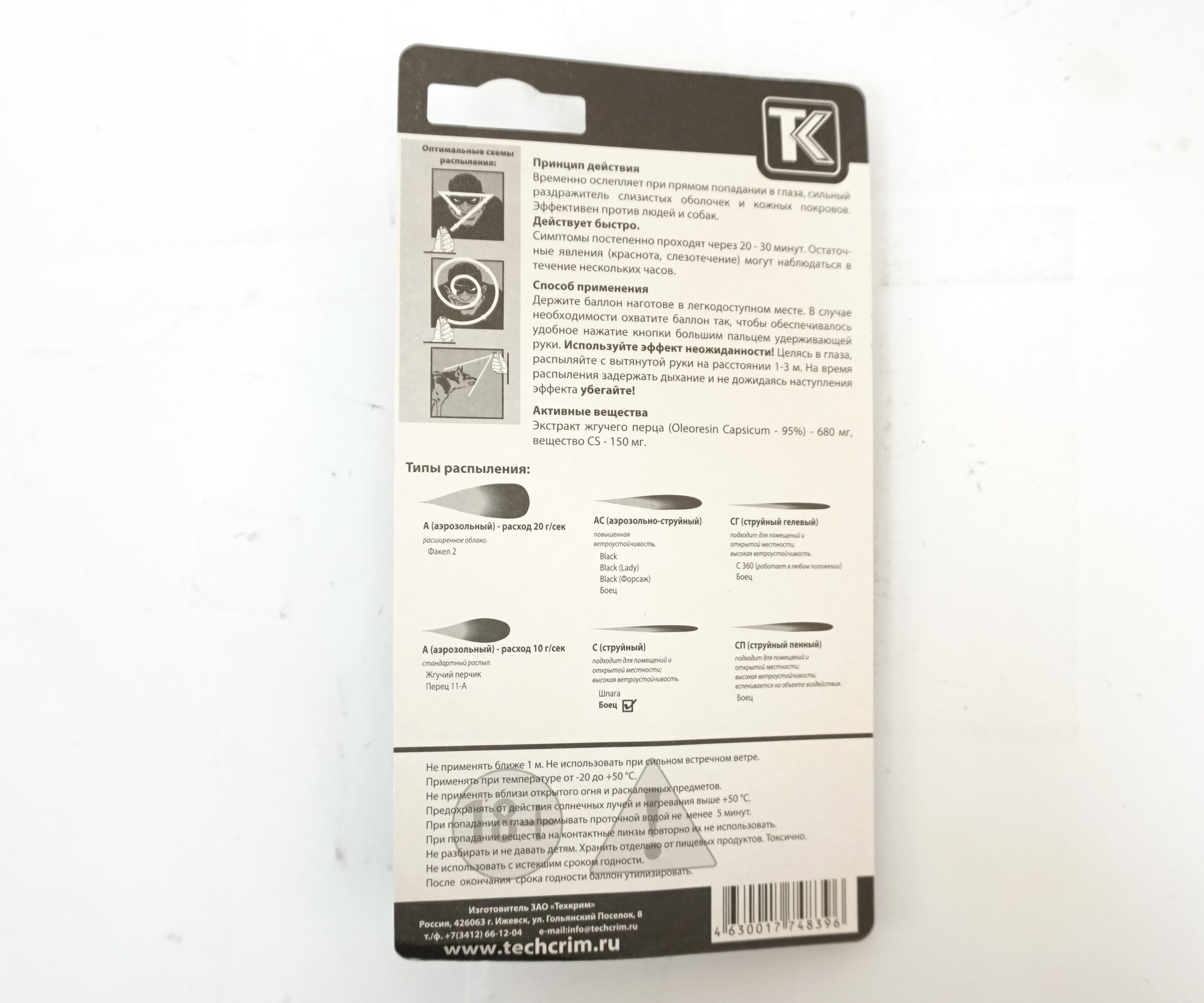 При нападении необходимо целиться в глаза злоумышленника, при этом задерживая дыхание, и сразу покинуть это место. Во избежание случайного нажатия на распылительную головку баллончик имеет защитную крышку. Кроме того, для нажатия необходимо приложить достаточные усилия, поэтому риск произвести непреднамеренное нажатие в данном случае минимальный. Объем баллончика 100 мл, вес 112 г. Продается без ограничений всем, кто достиг совершеннолетия.