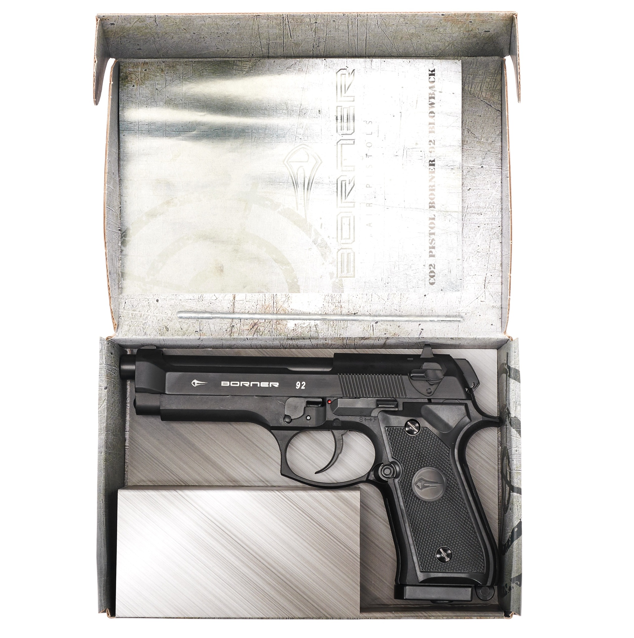 Пневматический пистолет Borner 92 разработан для стрельбы свинцовыми пулями калибра 4,5 мм. В основе его работы лежит газобаллонная система. В специальном отсеке размещается основной барабан и три дополнительных магазина, каждый из которых рассчитан на восемь зарядов.