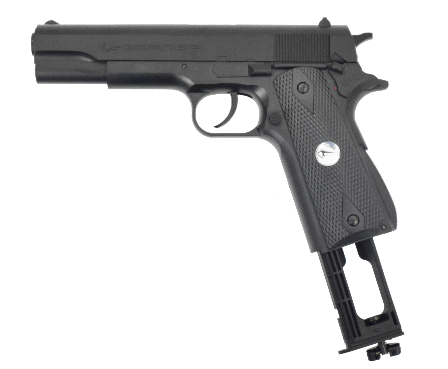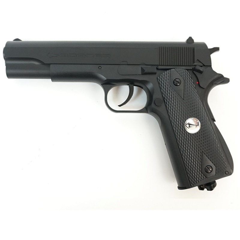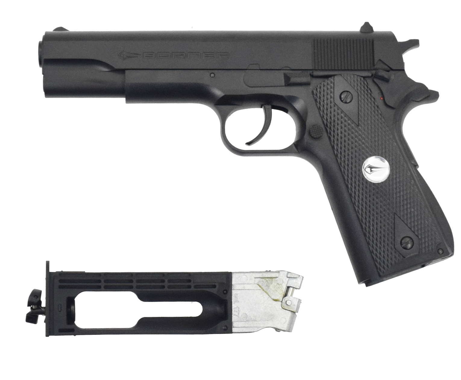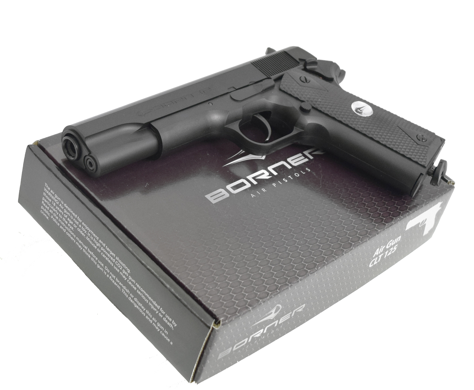 Пневматический пистолет Borner CLT125 является недорогой копией легендарного огнестрельного Colt 1911, сделанного одноименной компанией в США. Модель выполнена с размерами и габаритами боевого аналога, однако предназначена для развлекательной стрельбы.