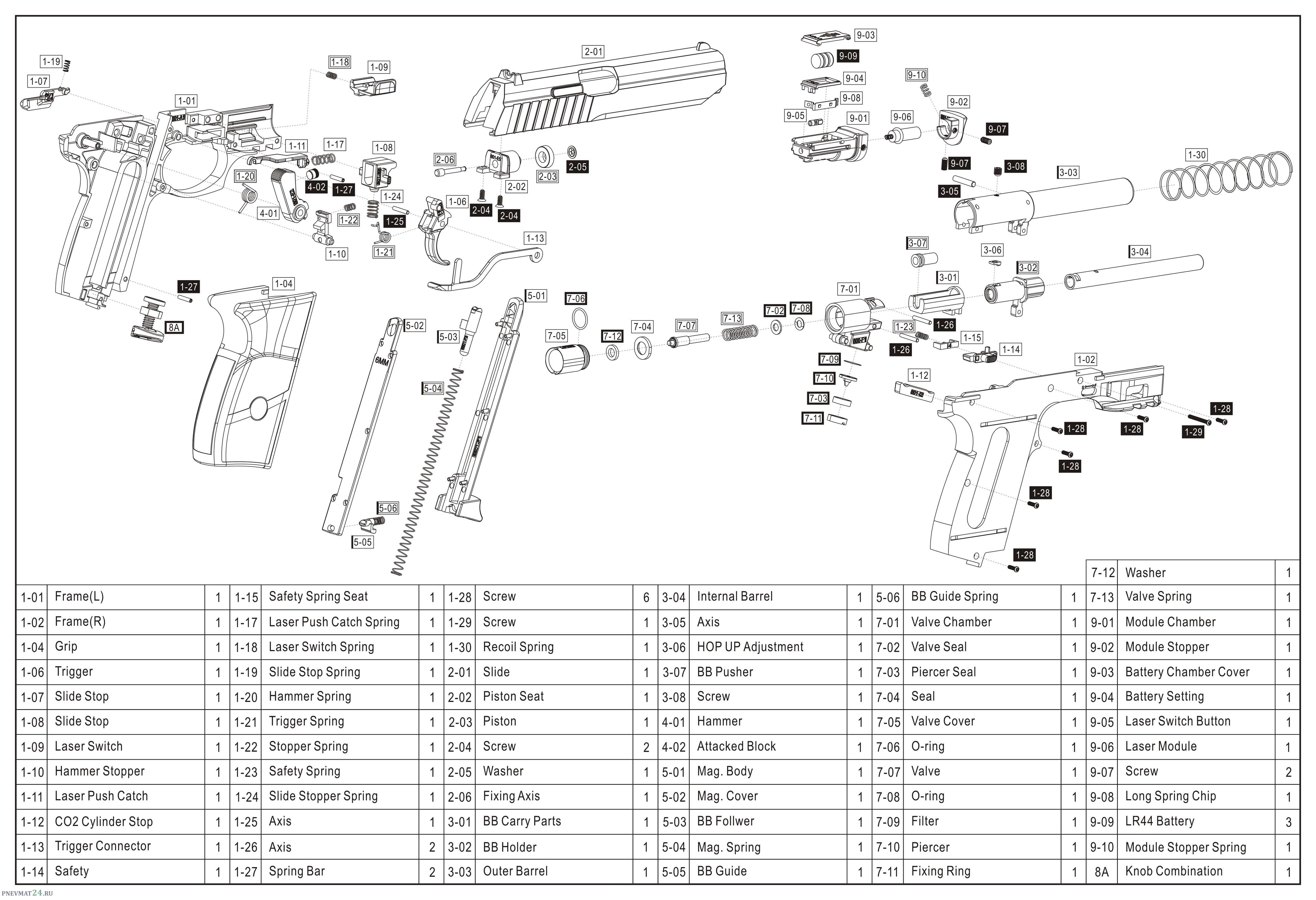 Комплектация : пистолет, магазин, шестигранный ключ, лазерный прицел (целеуказатель), батарейки, паспорт (инструкция)
