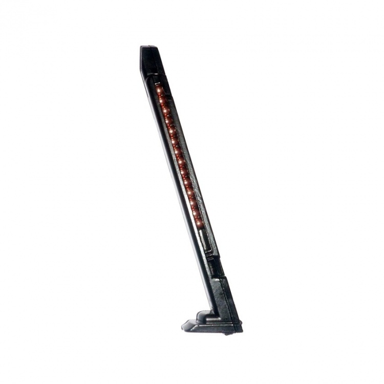 Стреляет пневматическая модель Borner PM сферическими пулями диаметра 4,5 мм. Иными словами эти пули называют стальными шариками ВВ. В магазин входит 17 пулек. Чтобы извлечь магазин, необходимо аккуратно поддеть его пятку. Материал для изготовления магазина - металл, защелка тоже металлическая и практически не изнашивается. Производитель гарантирует скорость выстрела 120 м/с.