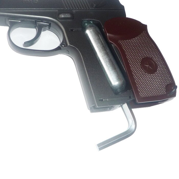Borner ПМ49 на рукоятке имеет темно-коричневую накладку, дополняющую сходство с известным Макаровым. Чтобы установить баллончик с СО2, необходимо сдвинуть пистолетную рукоятку назад. При этом открывается доступ к посадочному месту и поджимному винту.
