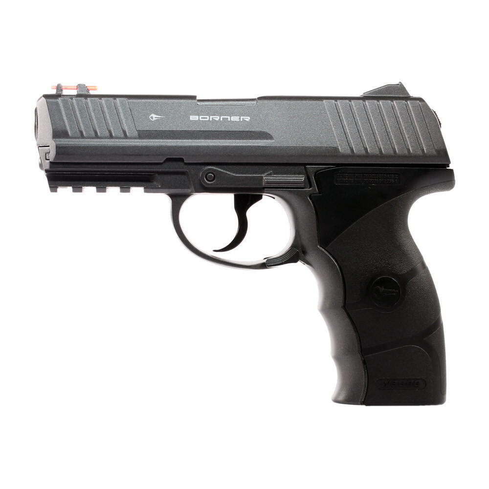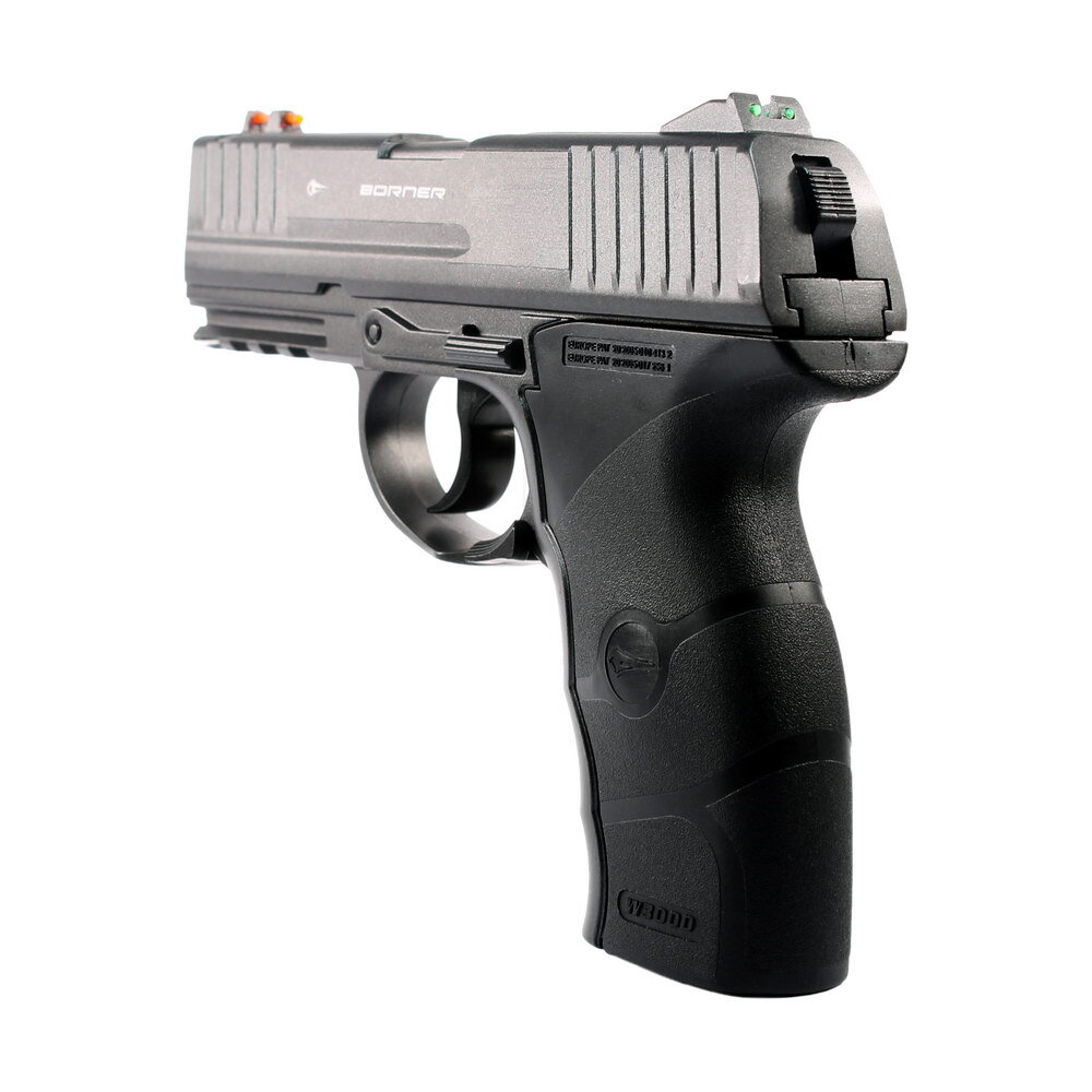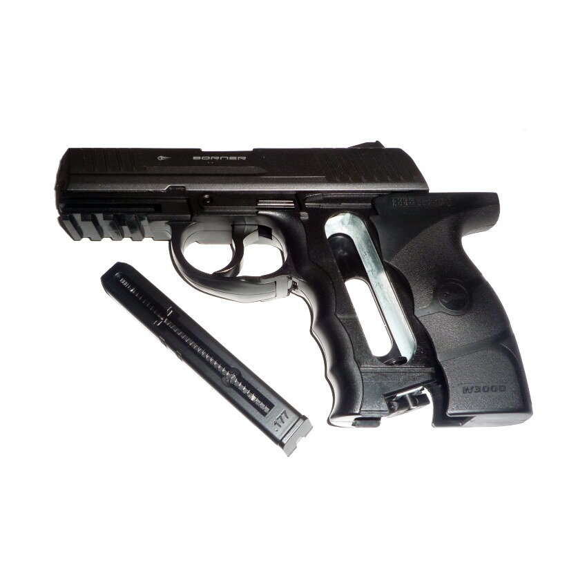 Borner W3000 – это одна из моделей пневматических пистолетов экономичного класса, которые производятся в Тайване. Тайванские производители оружия уже давным-давно покорили отечественный оружейный рынок, а посему, скорее всего, и новоиспеченный бренд борнер ждет аналогичная участь. В Россию оружие этой и других моделей от компании борнер стало поставляться лишь в конце 2011 года, однако интерес у рядовых потребителей к нему появился практически сразу. Сравнительно недорогое, но определенно качественное оружие естественно порождает вполне логичный спрос. Borner W3000 внешне повторяет характерные черты одного из реально существующих пистолетов огнестрельного типа. Поэтому реалистичность стрельбы из него уже гарантирована. Весит данная модель пневматики несколько больше половины килограмма (примерно пятьсот пятьдесят грамм), а это уже больше чем малый, но меньше чем большой вес. Собственно массу оружия можно считать идеальной, ведь она позволяет быть пистолету одновременно удобным в эксплуатации и не смахивать на игрушку. А ведь частенько слишком легкая пневматика напоминает стрелку пластмассовый игрушечный пистолет, а это очень негативно сказывается на ощущениях от стрельбы. Техническая начинка Borner W3000 позволяет стрелку, вооружившемуся таким оружием, чувствовать себя уверенно в любых условиях, на которое оно рассчитано. К примеру, пистолет подойдет как для развлечений, так и для спорта. Скорость выстрела из Borner W3000 составляет не более ста двадцати семи метров за секунду, а более, в общем то, и не нужно. Магазин пистолета свободно размещает внутри себя до восемнадцати зарядов. Но стоит учесть, что хранить оружие с заряженной обоймой противопоказано для его долговечности. Внутри магазина располагается обычная пружина, чья упругость при этом снижается, и возникают проблемы с подачей нескольких последних пуль при стрельбе.