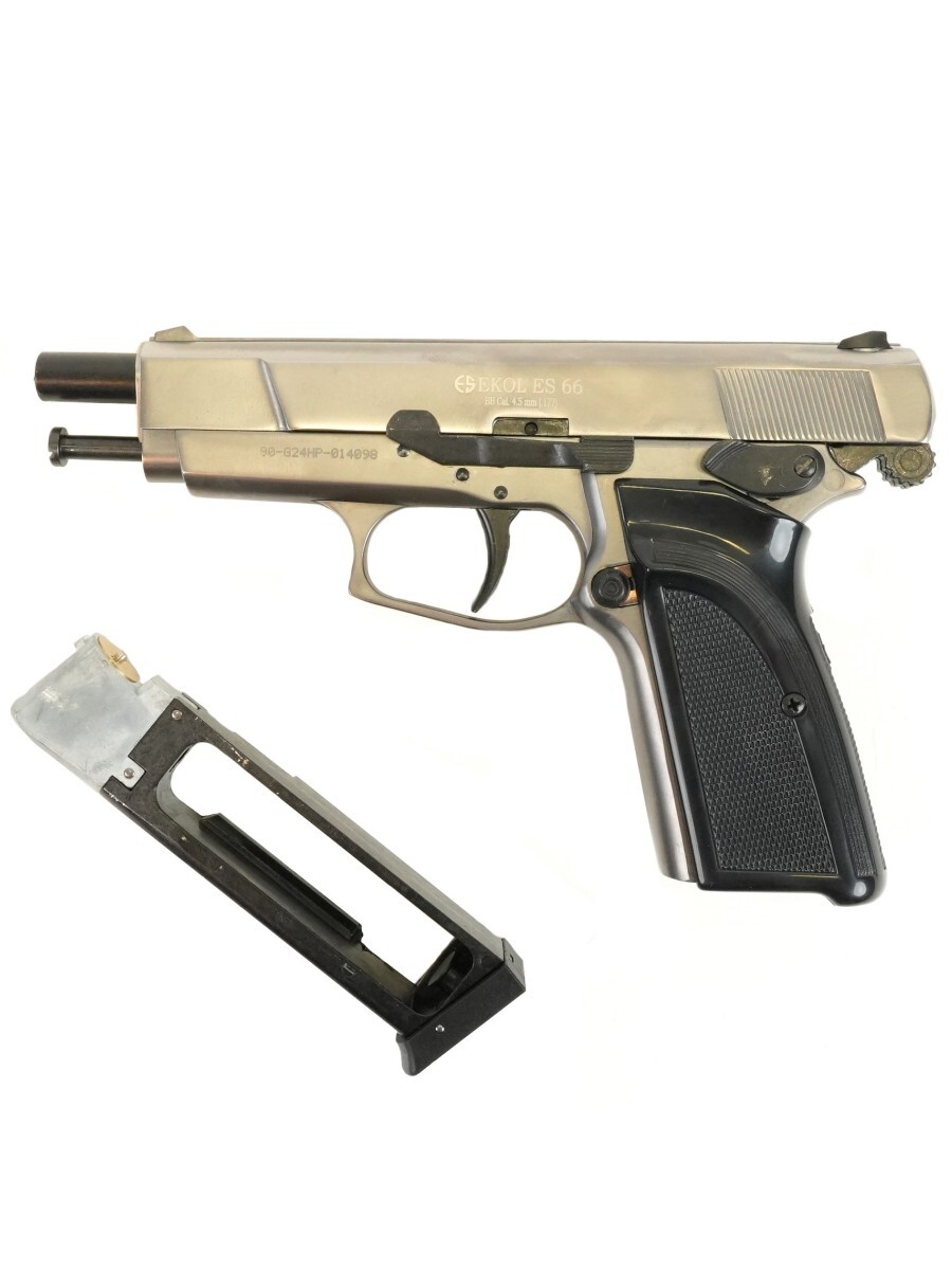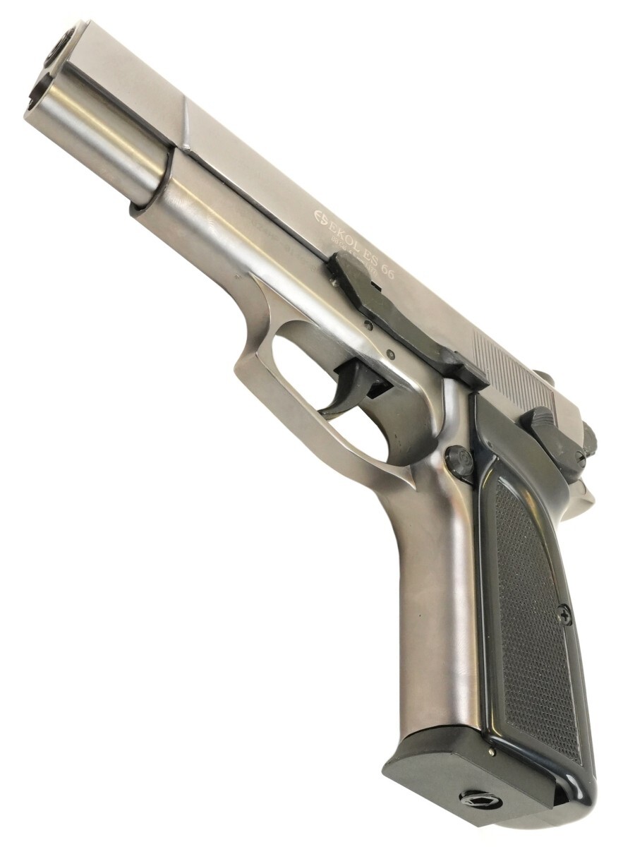 Прицельные приспособления - целик и мушка без возможности регулировки. Затвор и рамка пистолета Ekol ES 66 выполнены из никеля, накладки на рукоять - пластиковые.