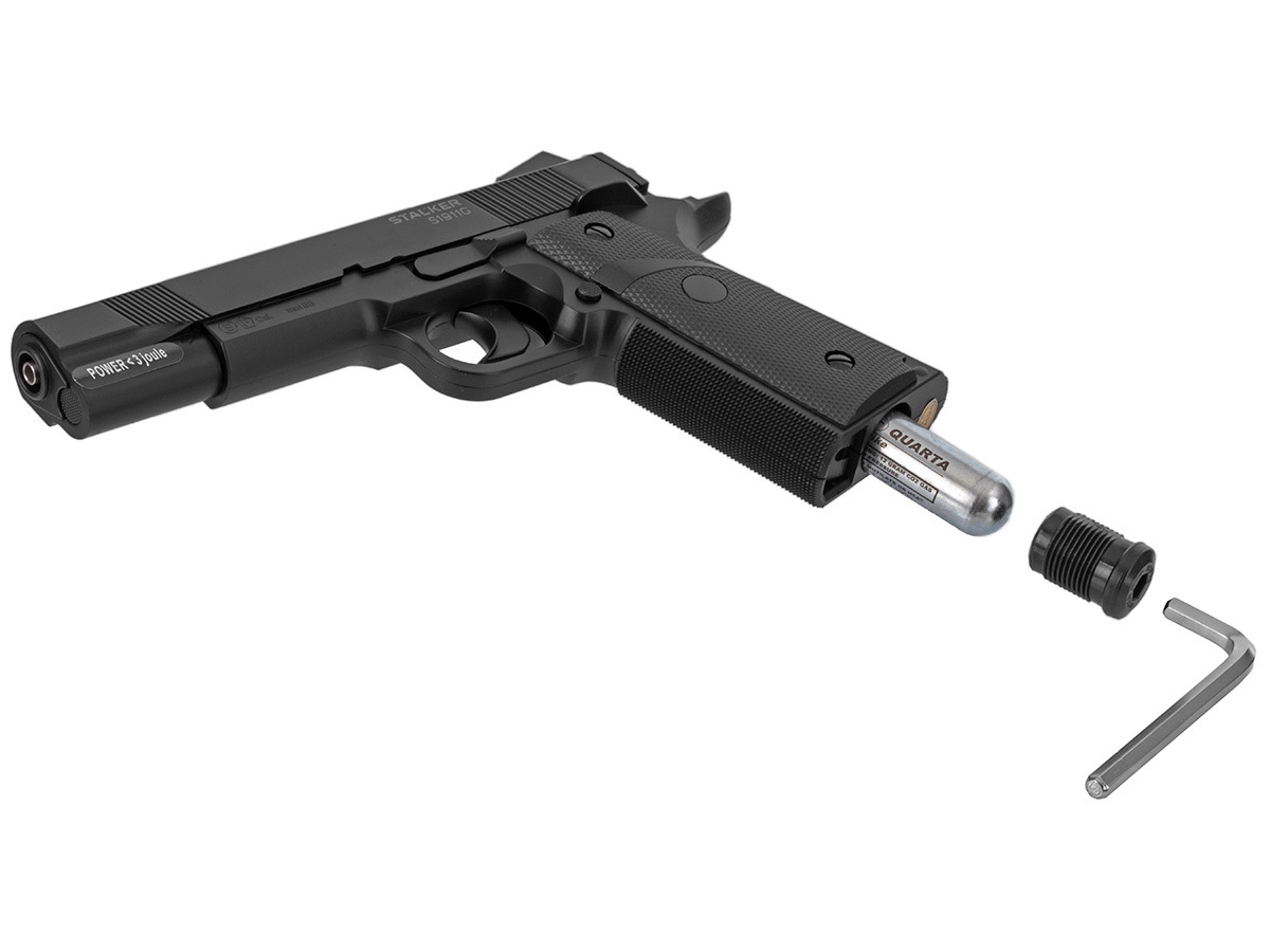 Источником энергии, сообщаемой пуле, в данном пистолете является баллончик CO2 на 12 гр. Магазин Stalker S1911G вмещает в себя 20 пуль – стальных шариков. Для приобретения пистолета не нужна лицензия.