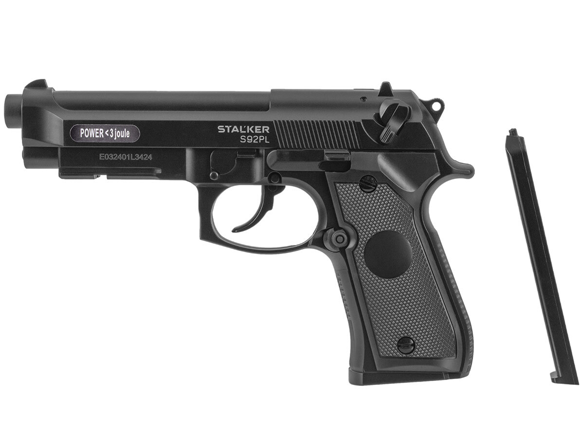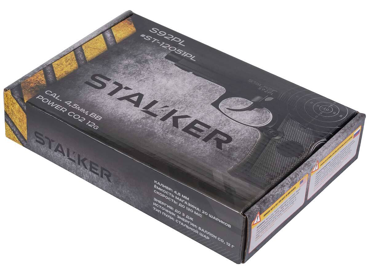 Пистолет удобно лежит в руке, она не устает даже при совершении длительных серий из нескольких выстрелов. Данный пистолет – газобалонный, он работает на 12-граммовом баллончике CO2. Скорость выстрела равняется 120 м/с. Пистолет отлично сбалансирован и работает практически без отдачи, благодаря чему в умелых руках он демонстрирует отличную кучность и точность стрельбы. Его можно одинаково успешно использовать и для спортивных целей, и для учебной или развлекательной стрельбы. Стреляет данный пневматический пистолет стальными шариками. В магазин пистолета вмещаются 13+1 таких шариков, в комплекте со Stalker S92PL идет один магазин. Дульная энергия у этой модели не превышает 3 Дж, соответственно, пистолет продается свободно: для его покупки не нужно получать разрешение на хранение и использование оружия.