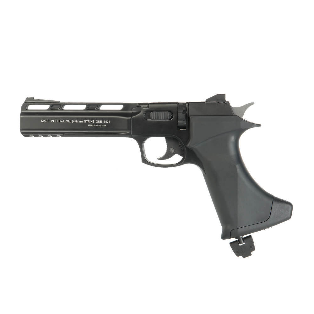 Пневматический пистолет Black Strike B026 – это одна из новинок в линейке газобаллонной пневматики от Strike One, модификация револьверного типа. Этот пистолет имеет удлиненный нарезной ствол длиной 17 см, а его конструкция во многом напоминает российский пистолет Корнет.