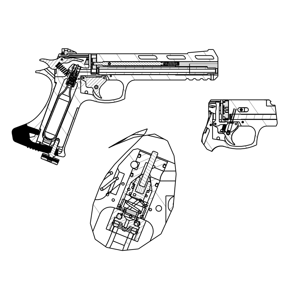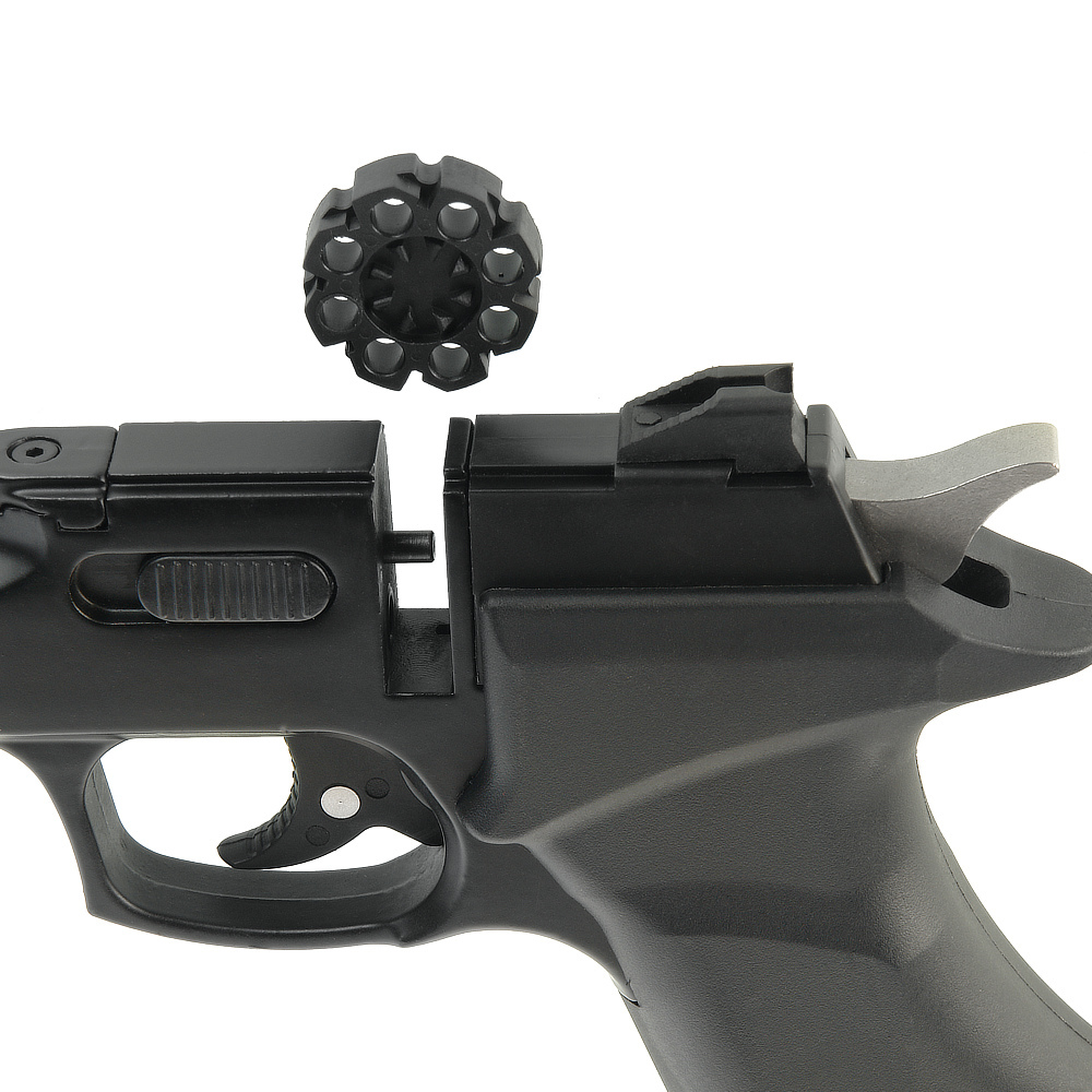 Источник энергии выстрела – баллон с углекислым газом, вес 12 г. Место установки баллона – рукоятка пистолета, полностью заполненный газом баллон позволяет произвести ок. 30 выстрелов. Емкость барабана – 8 снарядов (пневматических пуль калибра 4,5 мм).