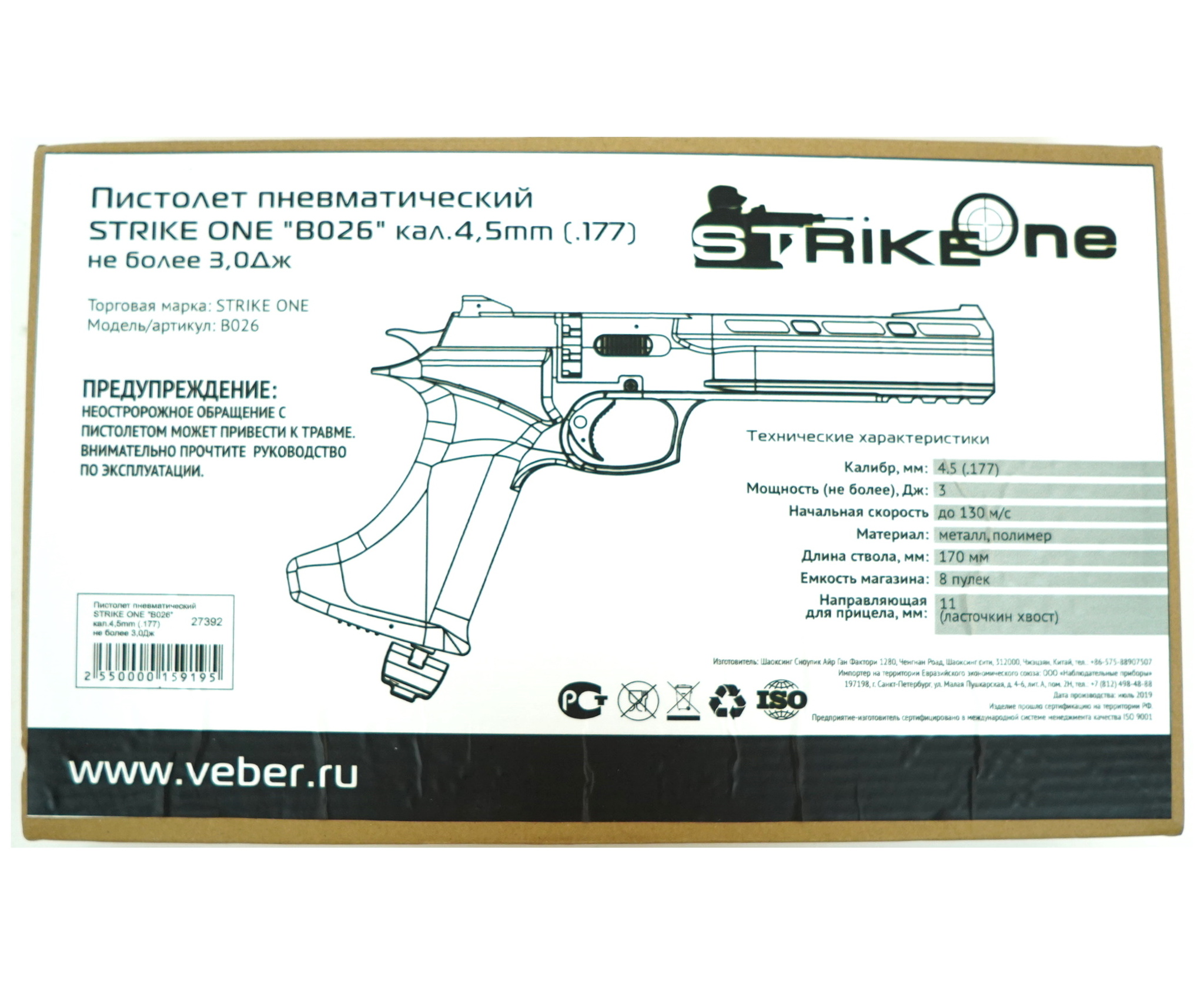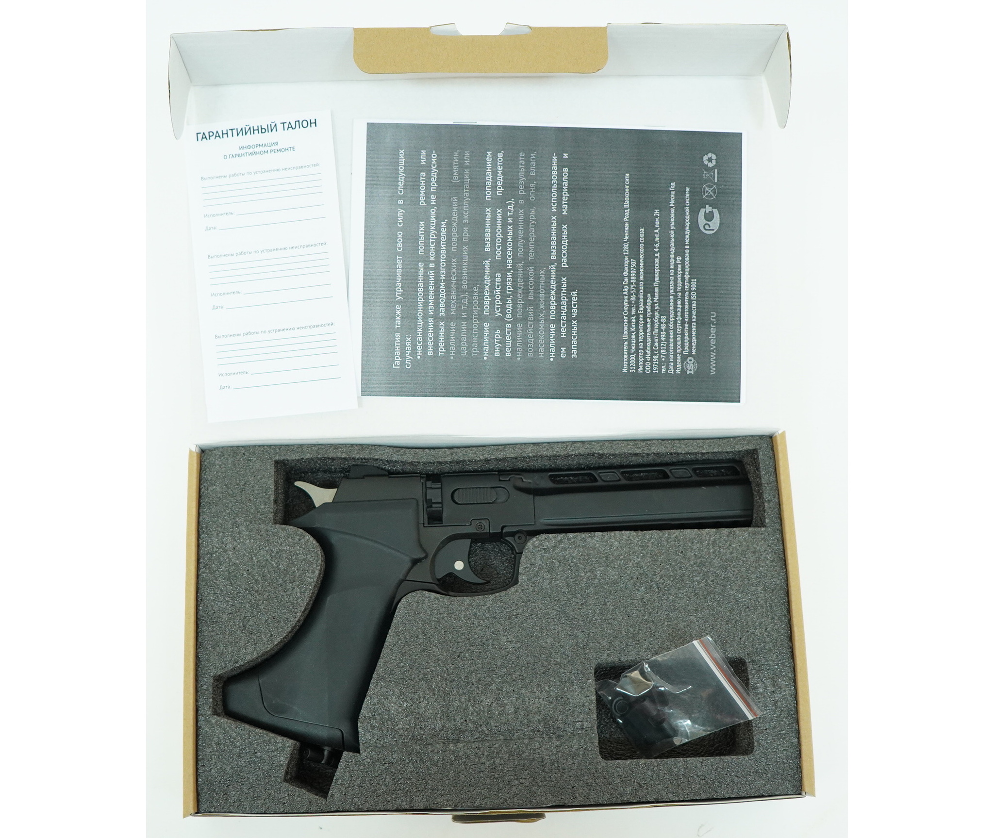 Длина пистолета 30 см, вес всего 0,6 кг. Поставляется с барабаном и руководством пользователя.