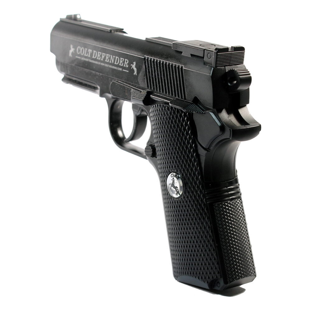 Umarex Colt Defender – недорогая и практичная модель конструктивно сходного с оружием изделия от немецкой оружейной компании Umarex, являющейся производителем высококачественного, можно сказать, элитного пневматического оружия. Бренд очень дорожит своим именем, поэтому, конечно, выпускать некачественное оружие было бы ему лишь в ущерб. В данном пистолете реализована конструкция подвижного ствола, отличающаяся мощностью выстрела и экономичностью. Пистолет имеет цельнометаллический корпус, придающий ему высокую надежность. Назначением данной модели пистолета является спортивно-развлекательная стрельба. Со всеми поставленными задачами пистолет справляется на сто процентов, поэтому счастливые обладатели Colt Defender на те же сто процентов довольны своим оружием. Технические данные пистолета имеют достойные показатели. Скорость выстрела до 130 м/с, что даже несколько выше, чем у некоторых более дорогих моделей от данного производителя. Составляет она сто тридцать метров в секунду. Весит пистолет приблизительно семьсот тридцать грамм, что почти соответствует боевому оригиналу. Colt Defender является пневматической копией легендарного американского кольта, на что обязательно стоит обратить внимание стрелков. Данная модель пистолета обладает исключительной точностью для пистолетов, стреляющих самовзводом. Во всех остальных случаях при условии, что стрелок хоть сколько-нибудь знаком с пневматикой точность выстрела из Colt Defender – это правило. Источник энергии - баллончик СО2 12 грамм. Магазин рассчитан на шестнадцать шариков ВВ калибра 4,5 мм.