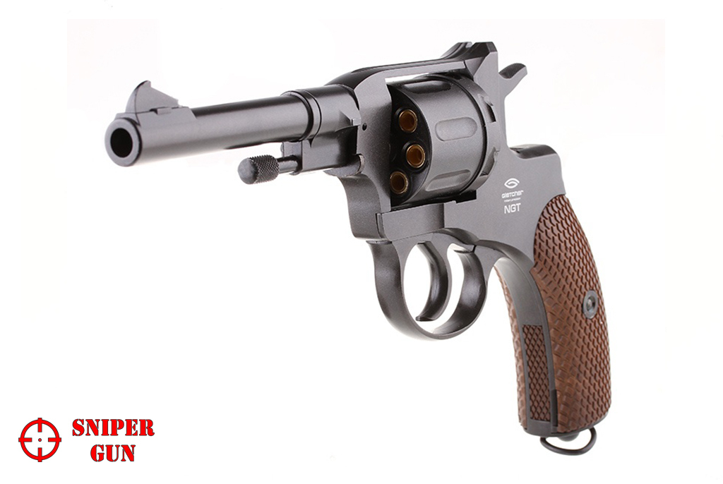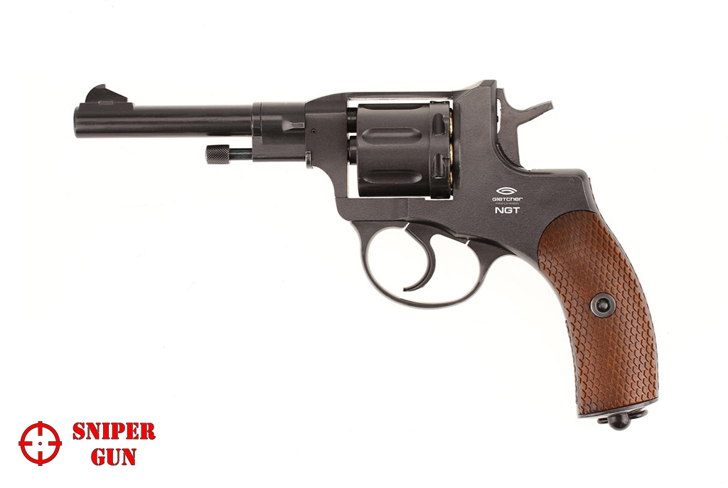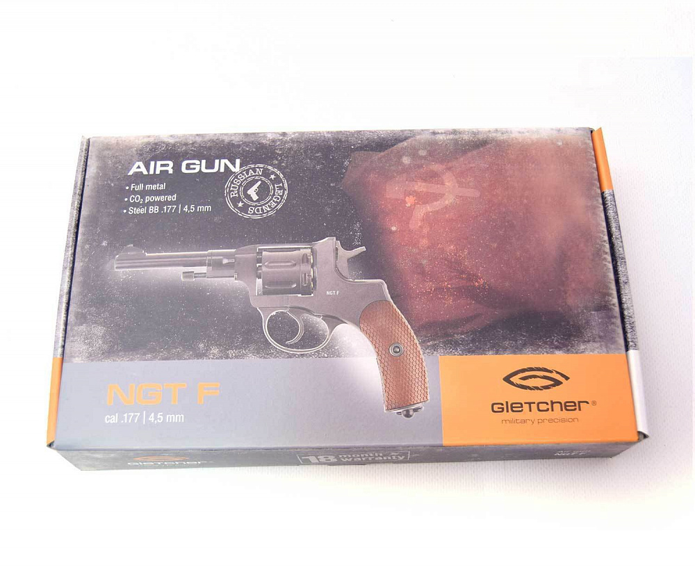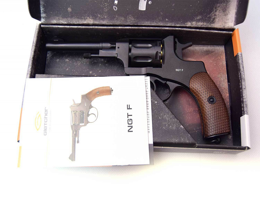 Револьвер Gletcher NGT Black - пневматическая реплика Револьвера системы Нагана, созданного в 1892 году бельгийскими оружейниками. Появилась в продаже в 2013 году и сразу привлекла внимание как рядовых почитателей пневматики, так и любителей пневматических револьверов. И конечно, особенный восторг Gletcher NGT Black вызвал у ценителей исторической классики. Особо стоит отметить высокую копийность револьвера – размер, вес, а также неполная разборка - всё соответствует оригиналу! Процесс заряжания позволяет полностью погрузиться в атмосферу начала ХХ века, т.к. Gletcher NGT Black снабжён фальшпатронами, которые вставляются в барабан. Стрельба возможна как самовзводом, так и с предварительным взведением курка - Gletcher NGT имеет ударно-спусковой механизм двойного действия (Double Action). В качестве уступки технике безопасности Gletcher NGT снабжён флажковым предохранителем на правой стороне рамки, который абсолютно не выбивается из общего дизайна. Источником энергии выступает 12 граммовый баллончик с газом СО2, который удачно спрятан в рукоятку с накладками «под дерево». Поджимной винт баллона имеет вид антабки (кольцо на рукоятке для крепления ремня) и не привлекает внимания! Револьвер Gletcher NGT Black изготовлен из металла за исключением накладок на рукоятки. Начальная скорость стальных шариков ВВ диаметром 4,5мм, которыми снаряжаются фальшпатроны, достигает 110 м/с. С одного баллона Gletcher NGT позволяет сделать до сотни полноценных выстрелов (вместимость барабана 7 шариков). Точность на расстоянии до 10 метров поражает даже бывалых стрелков, особенно с предварительным взводом курка. Револьвер Gletcher NGT Black можно однозначно рекомендовать к покупке любителям без спешки пострелять «на точность», а не на количество выстрелов в минуту, а также коллекционерам копий боевого оружия.