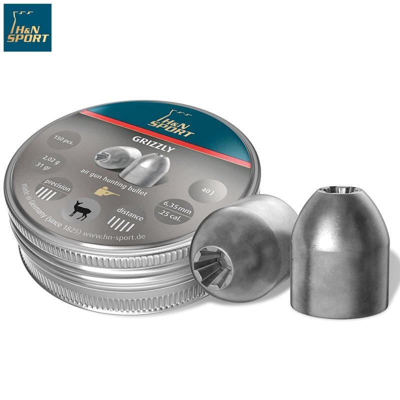 Пули пневматические H&N Grizzly 6,35 мм 2,02 грамма (150 шт.) - тяжелые свинцовые пули от компании H&N Sport, которые предназначены для мощных пневматических винтовок для стрельбы на средних дистанциях. Пули H N Grizzly 6.35 отличает высокая передача энергии и экспансивность с наивысшим шоковым воздействием. Поверхность пули H N 6 35 Grizzly гладкая. Звездообразное отверстие в верхней части пули H N Grizzly 6 35 мм гарантирует идеальное грибообразное раскрытие (165 % калибра) и наивысшую передачу энергии на тело дичи. Выемка в днище пули H N Grizzly 6.35 обеспечивает великолепную притирку в канале ствола и оптимальное использование энергии. Рекомендуемая дульная энергия 40 дж. В упаковке 150 шт.