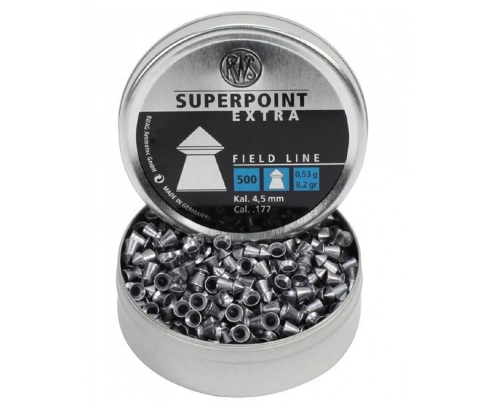 Свинцовые пневматические пули RWS Superpoint Extra калибра 4,5 мм массой 0,53 грамма (8,2 гран). Это пуля средней массы для стрельбы из пневматической винтовки. Имеет конусообразную головную часть, что обеспечивает высокую пробиваемость и проникающую способность. Данная пневматическая пуля RWS Superpoint Extra снискала большую популярность среди охотников. Оптимальное распределение массы изделия способствует высокой точности попадания.