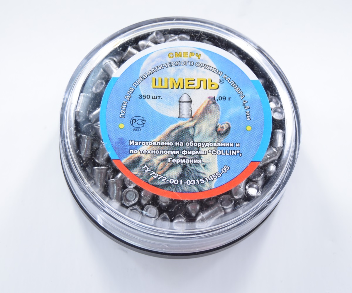 Пули пневматические Шмель 4,5 мм 1,09 грамма (350 шт.) - тяжелые свинцовые пули российского производства, используемые для охоты. Пули Шмель характеризуют отличные баллистические показатели. Калибр пуль 4,5 мм. Вес 1,09 гр. В банке 350 шт.